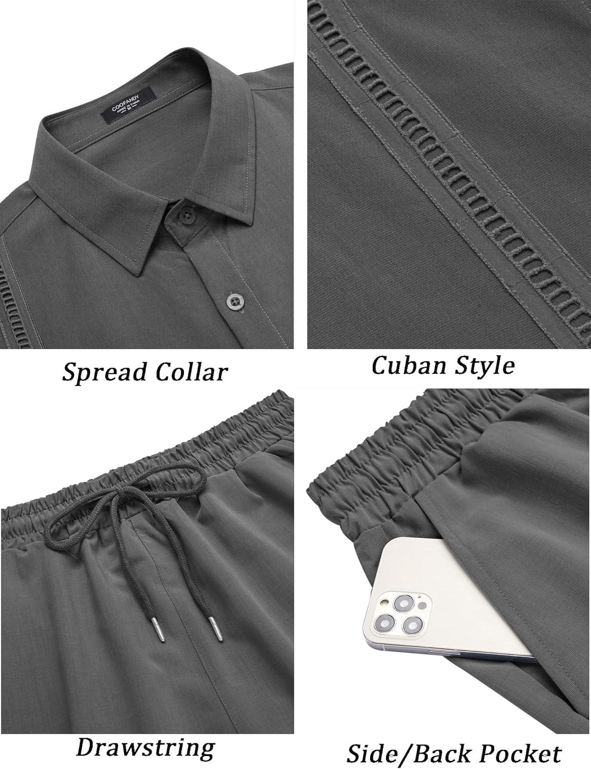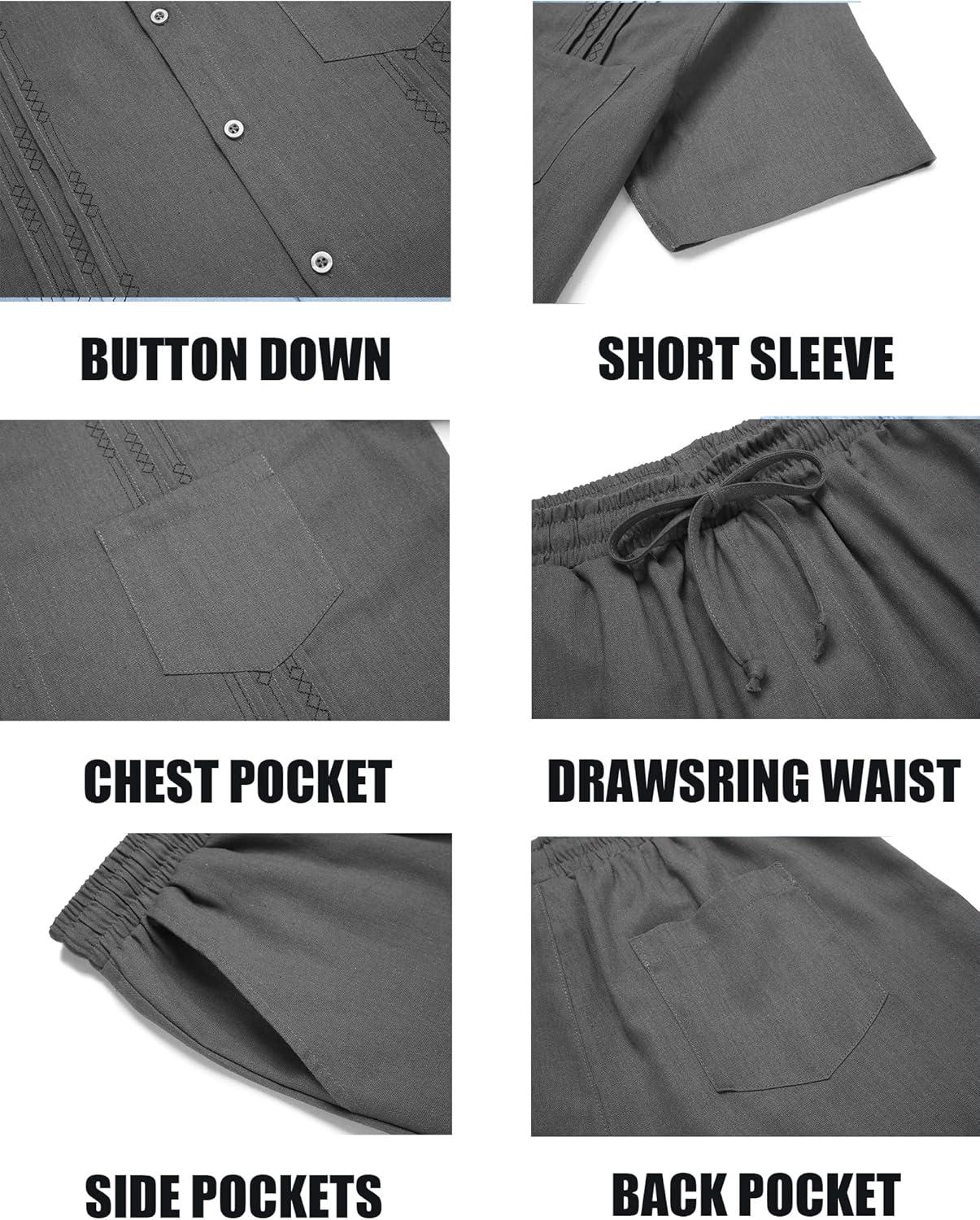 COOFANDY Men Linen Sets Outfits 2 Piece Short Sleeve Cuban Shirts Guayabera Linen Suit(Dark Gray)