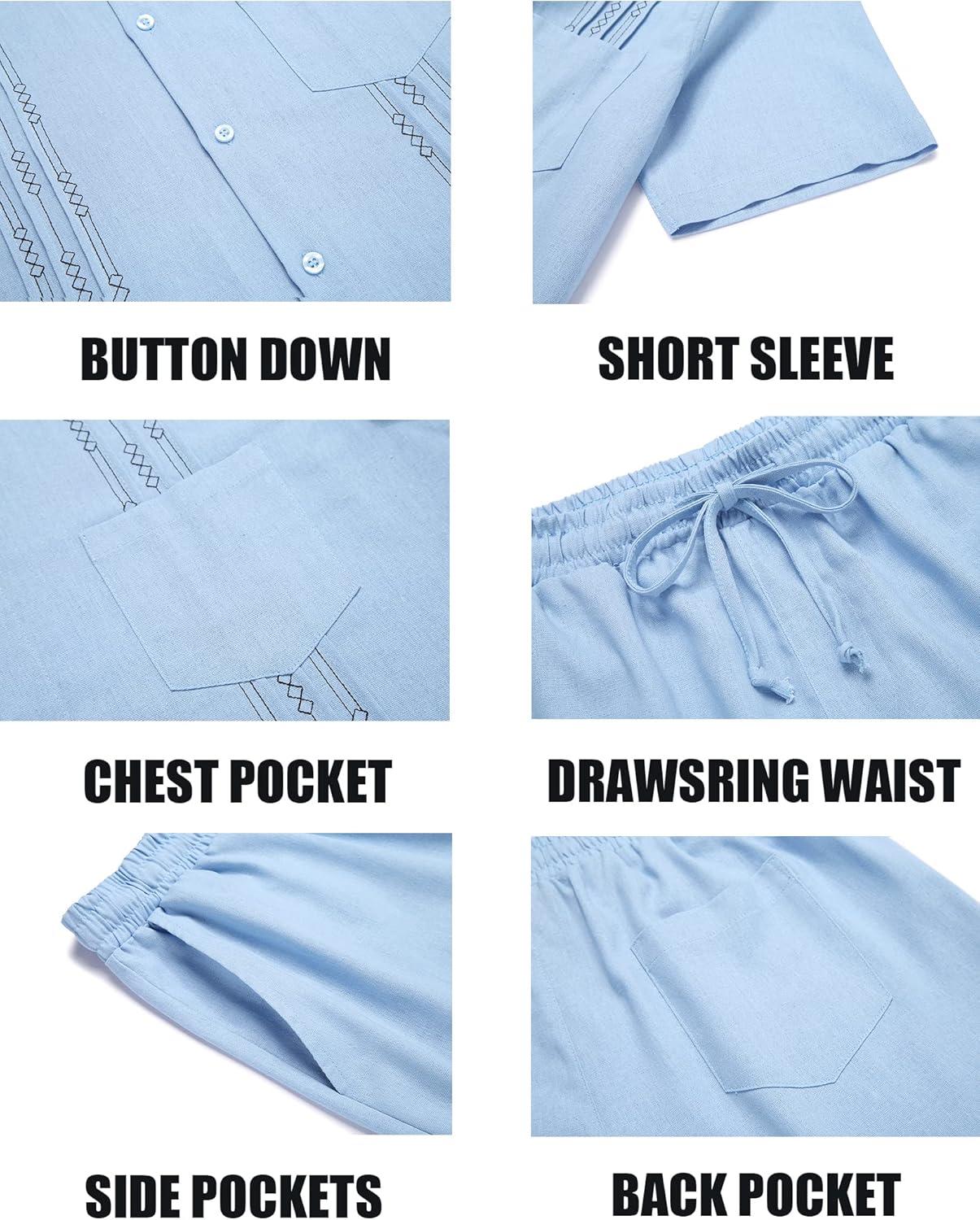 COOFANDY Men Linen Sets Outfits 2 Piece Short Sleeve Cuban Shirts Guayabera Linen Suit(Sky Blue)