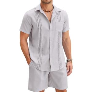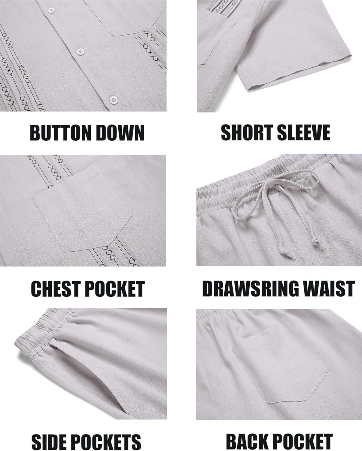 COOFANDY Men Linen Sets Outfits 2 Piece Short Sleeve Cuban Shirts Guayabera Linen Suit(Light Gray)