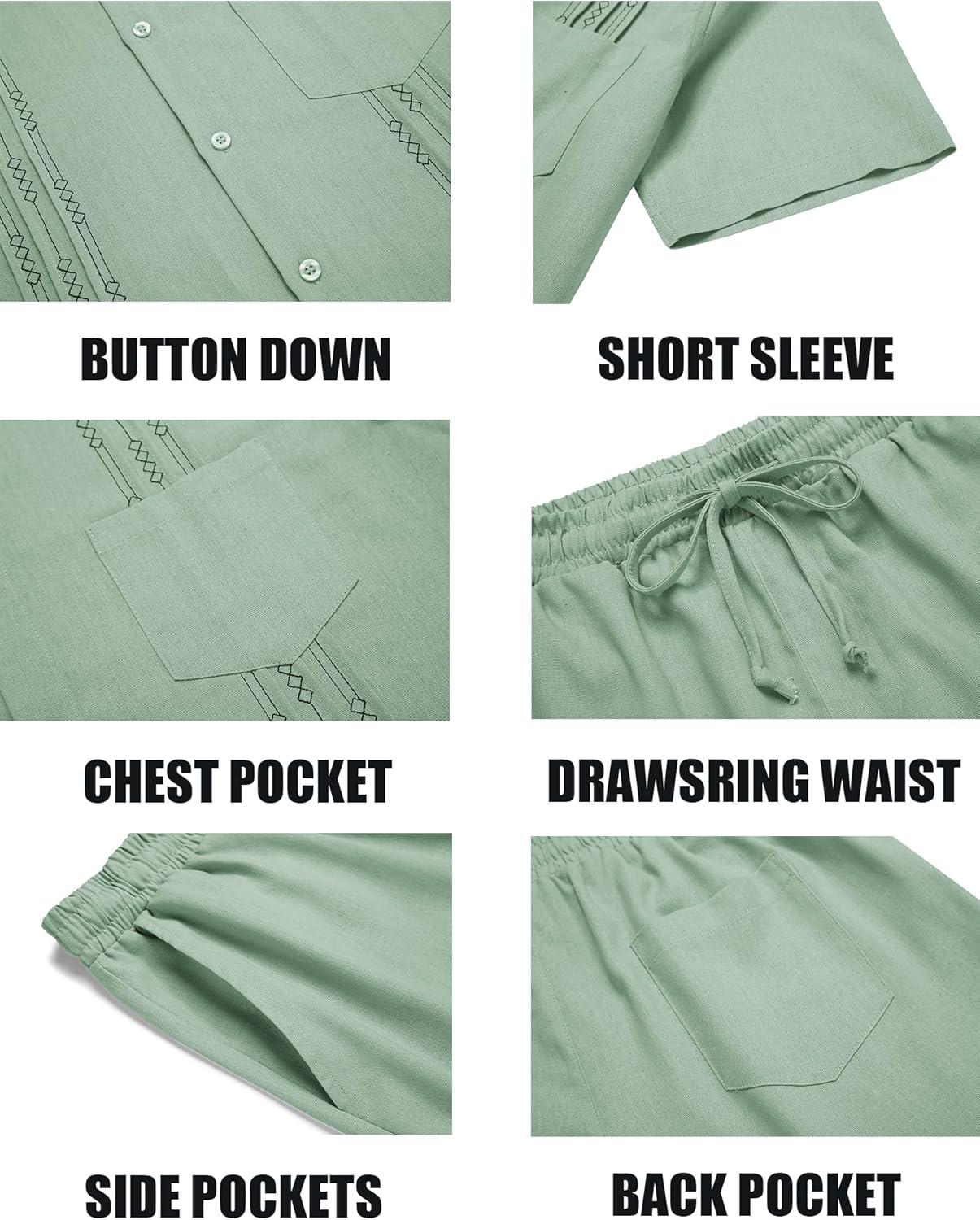 COOFANDY Men Linen Sets Outfits 2 Piece Short Sleeve Cuban Shirts Guayabera Linen Suit(Light Green)