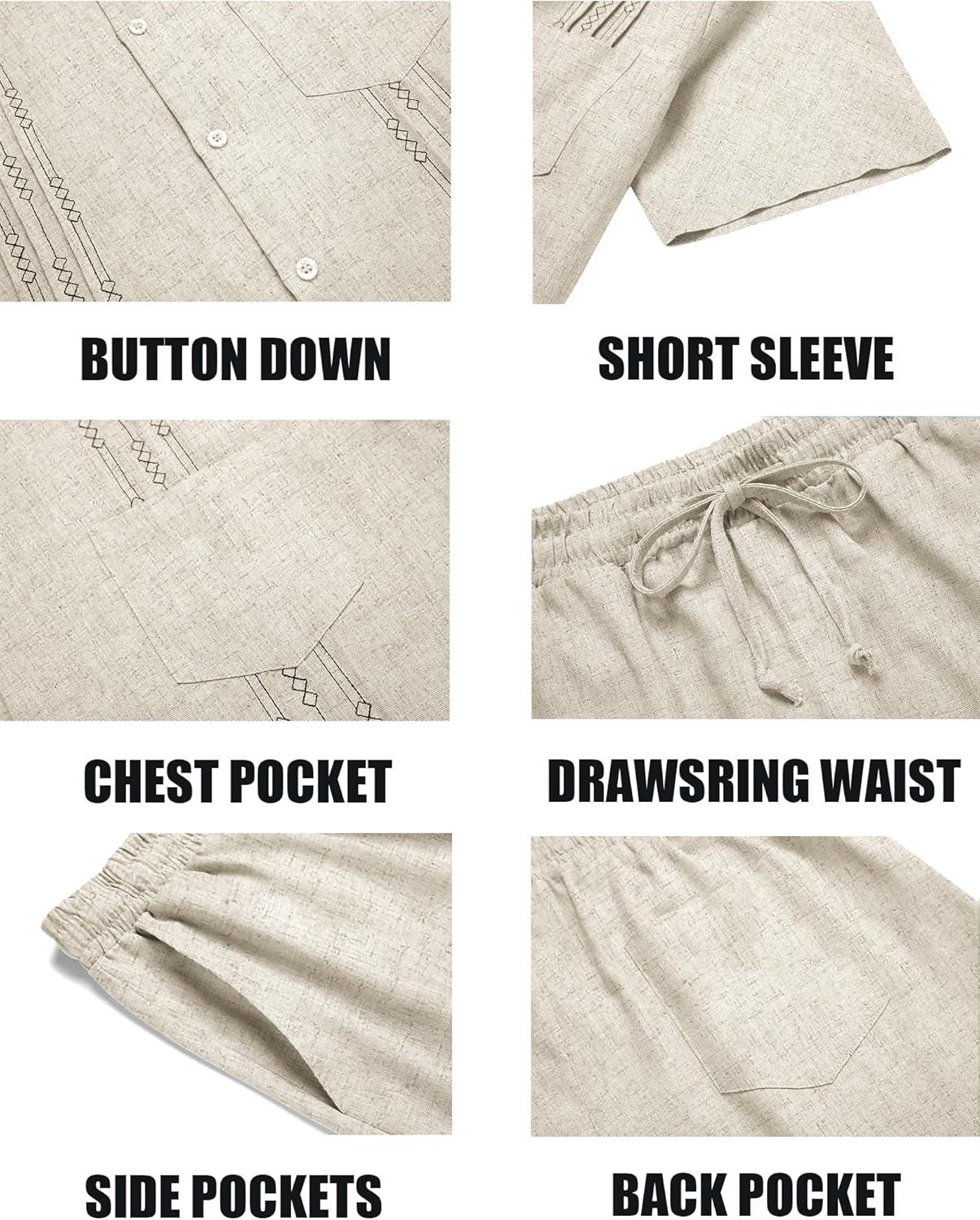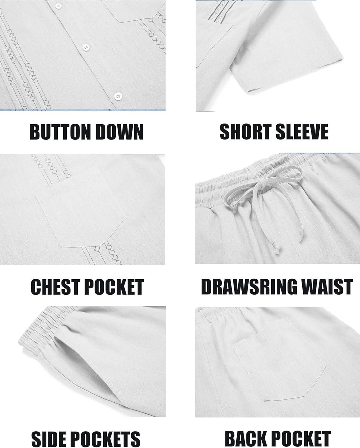 COOFANDY Men Linen Sets Outfits 2 Piece Short Sleeve Cuban Shirts Guayabera Linen Suit(White)