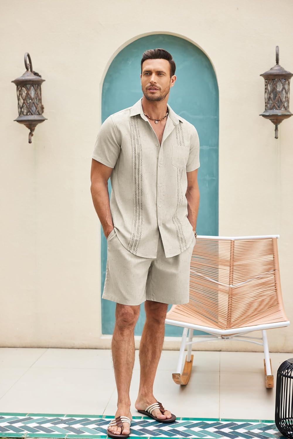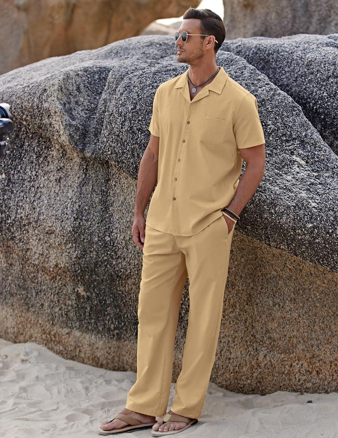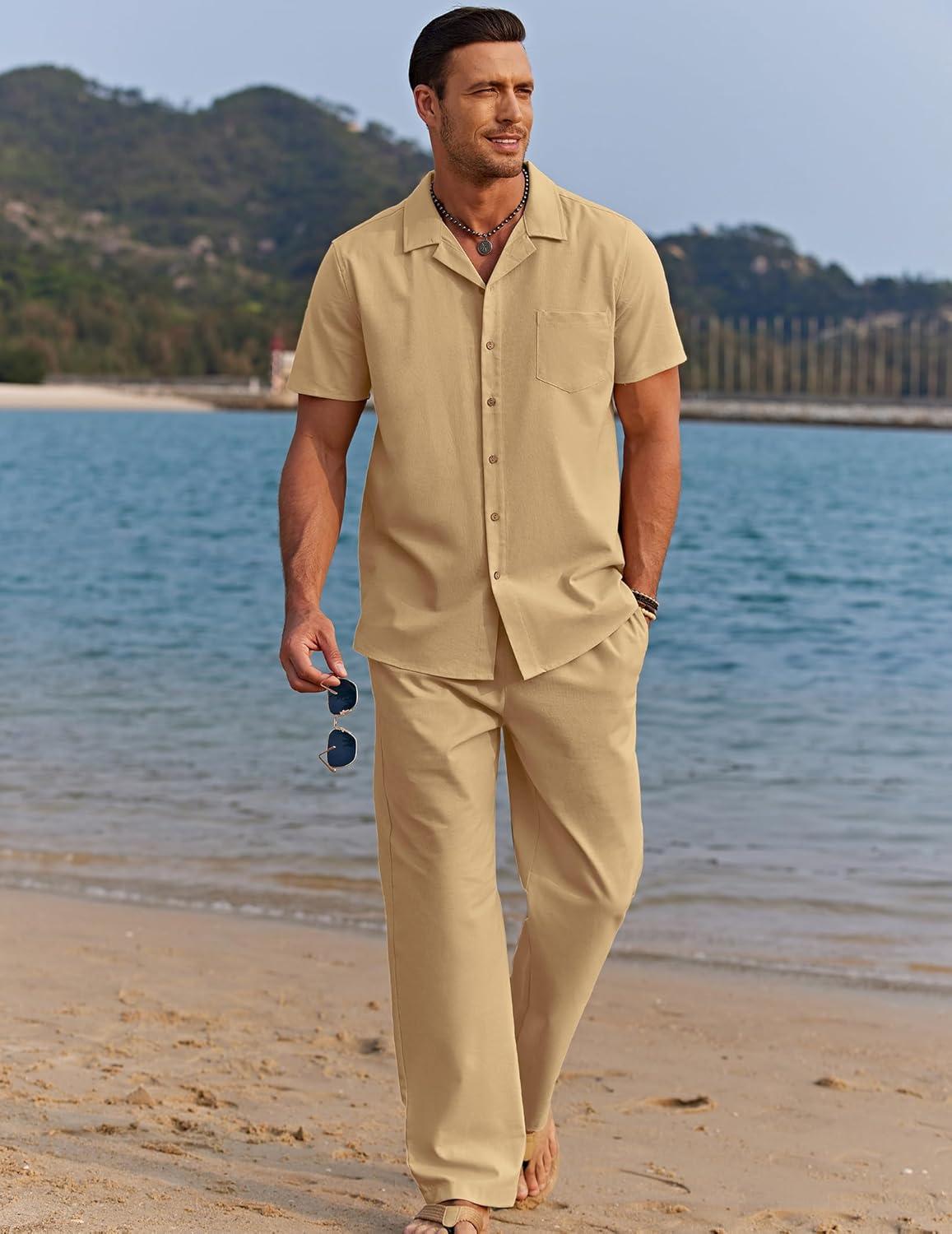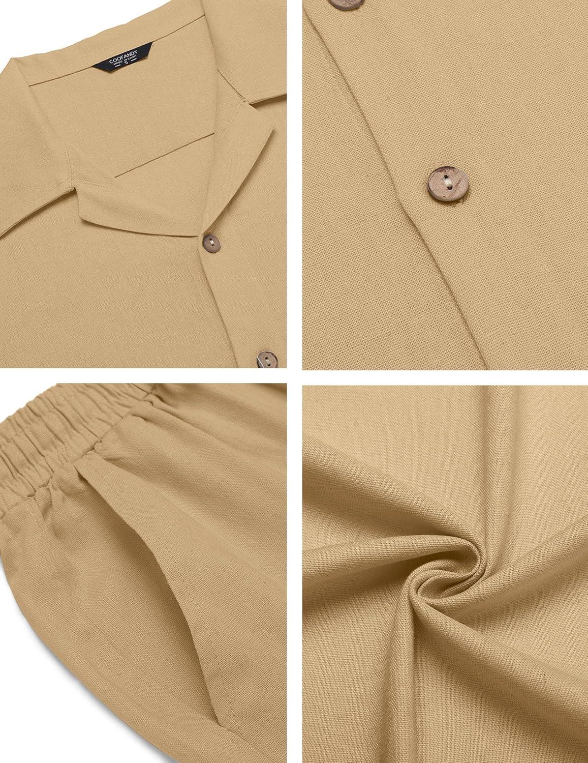 COOFANDY Men Linen Sets Outfits 2 Piece Short Sleeve Cuban Shirts Guayabera Linen Suit(Khaki)