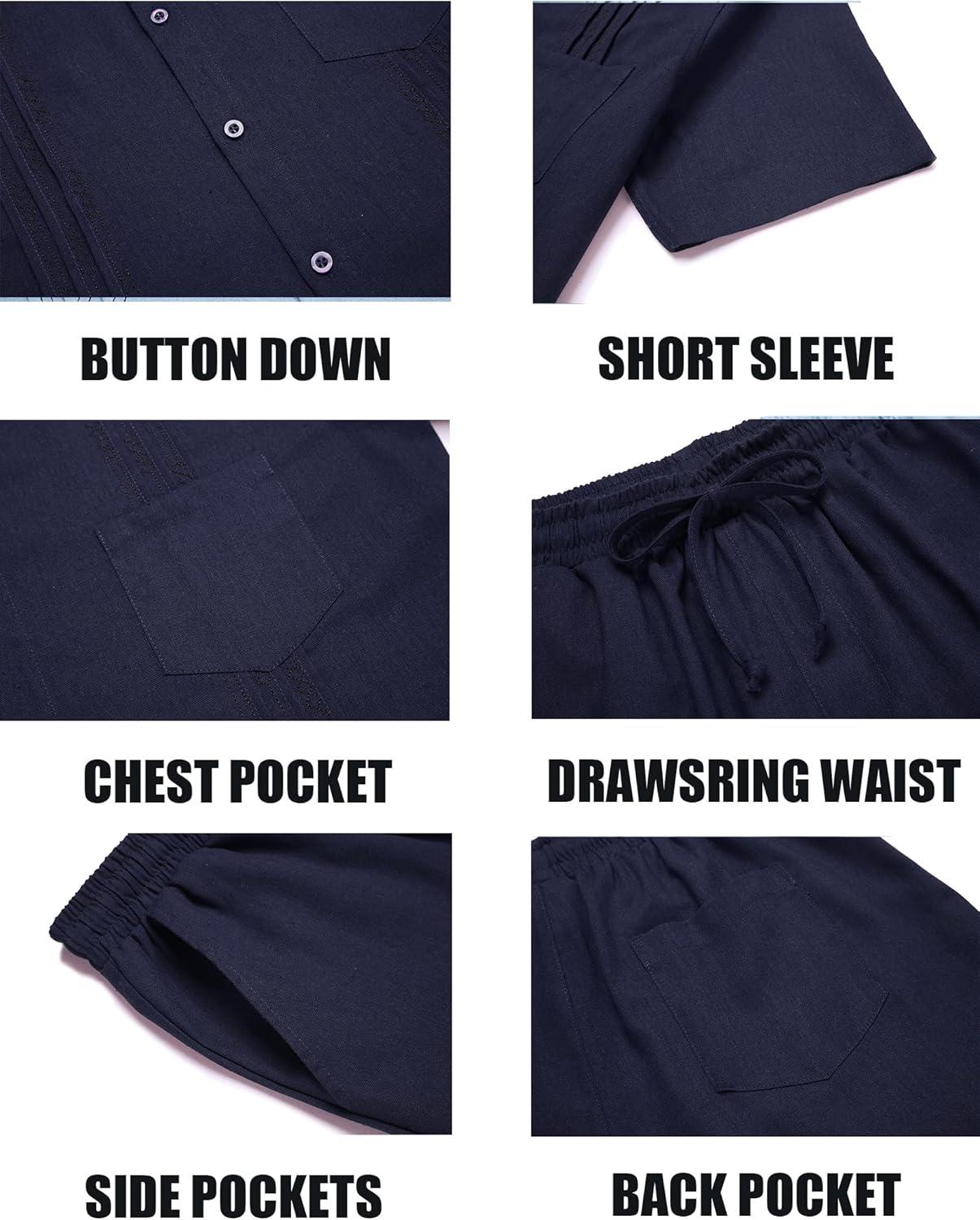 COOFANDY Men Linen Sets Outfits 2 Piece Short Sleeve Cuban Shirts Guayabera Linen Suit(Navy Blue)