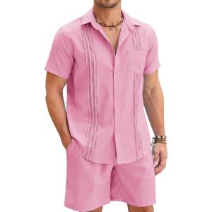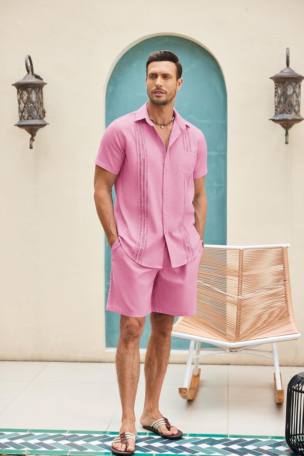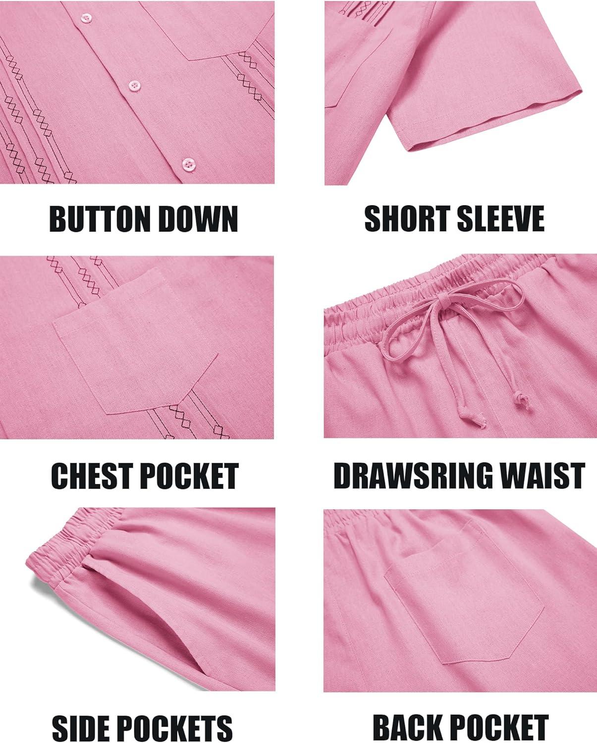 COOFANDY Men Linen Sets Outfits 2 Piece Short Sleeve Cuban Shirts Guayabera Linen Suit(Pink)