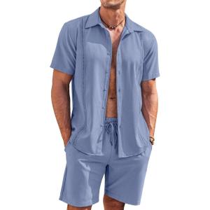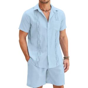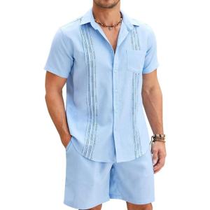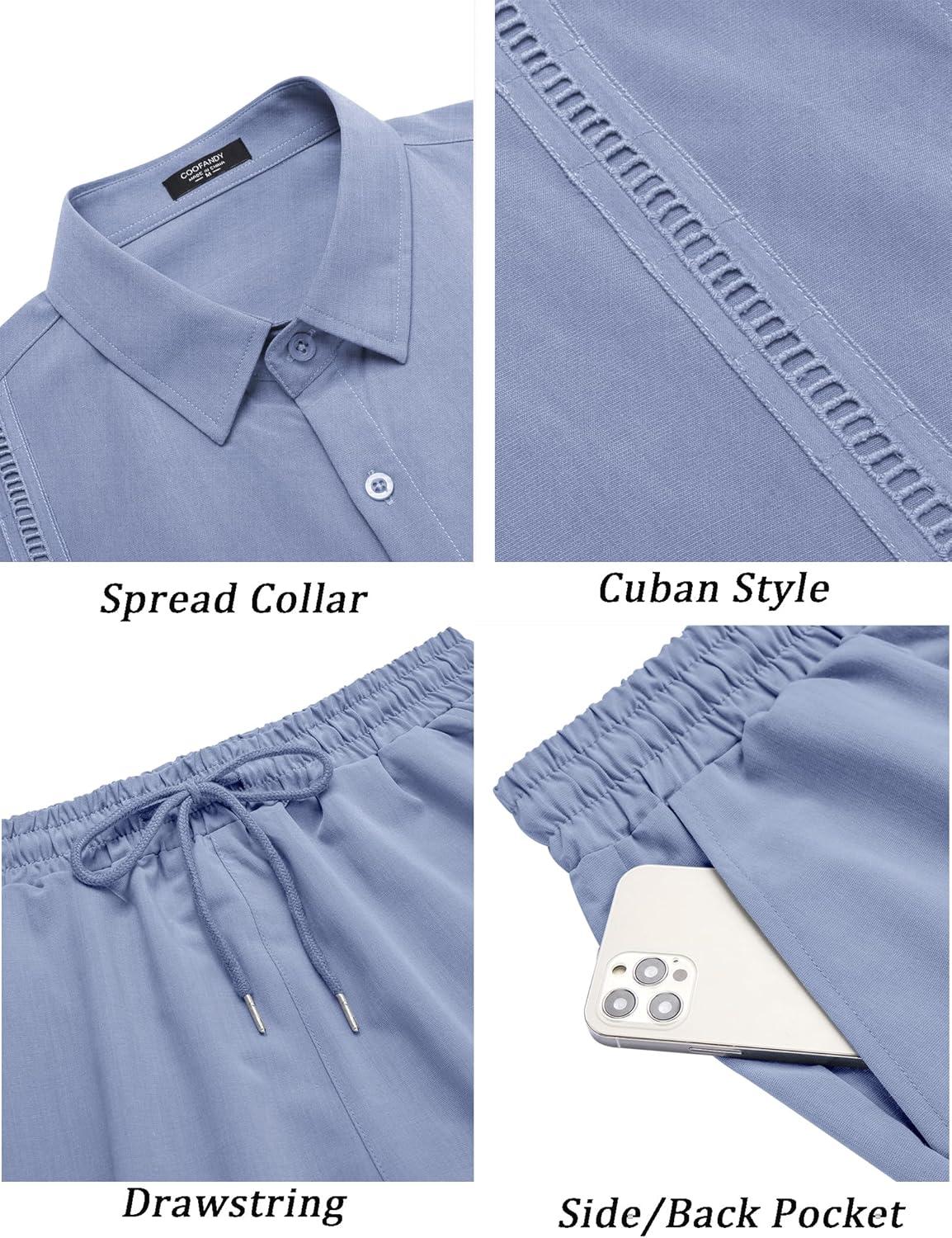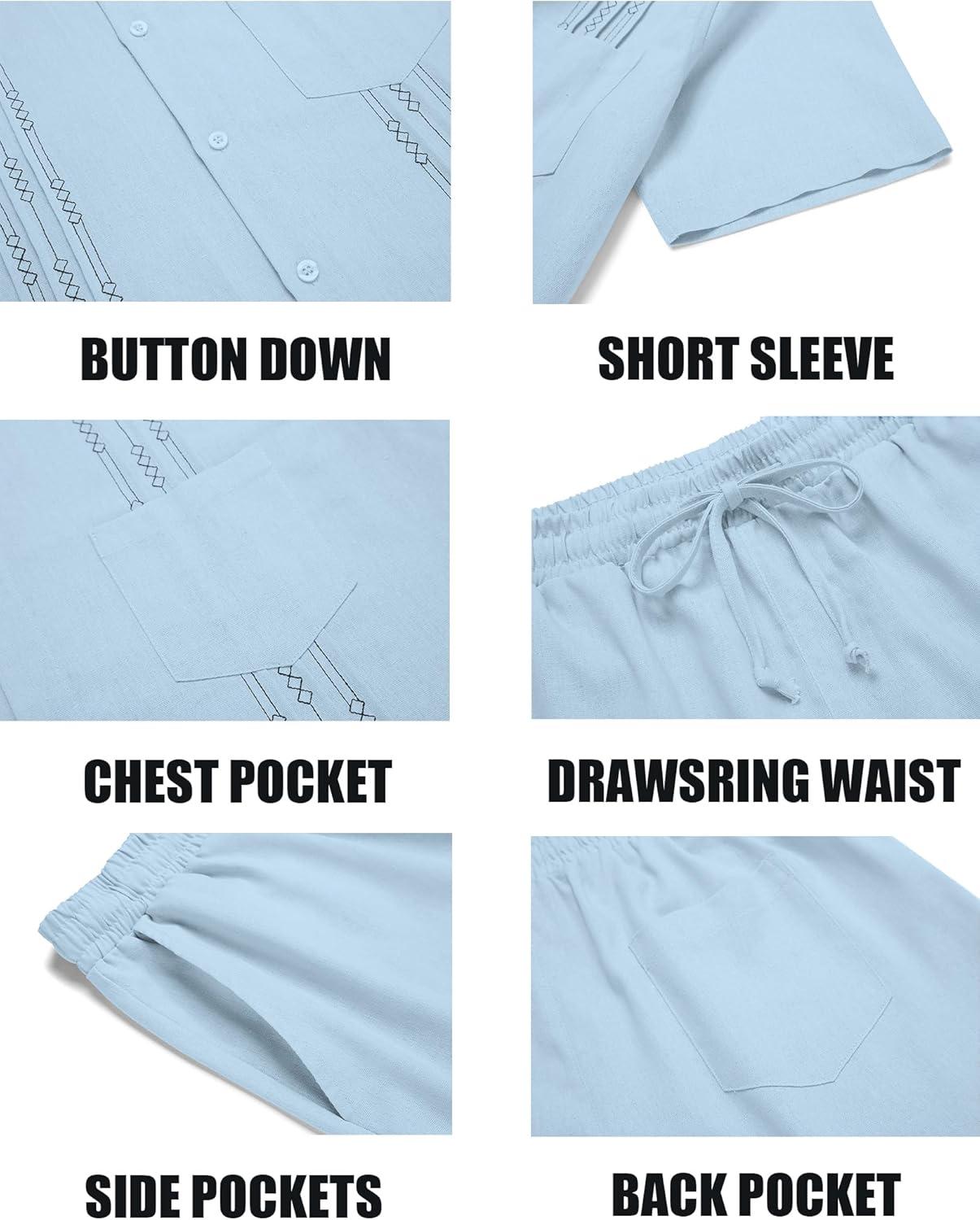COOFANDY Men Linen Sets Outfits 2 Piece Short Sleeve Cuban Shirts Guayabera Linen Suit(Light Blue)