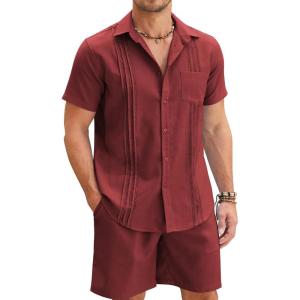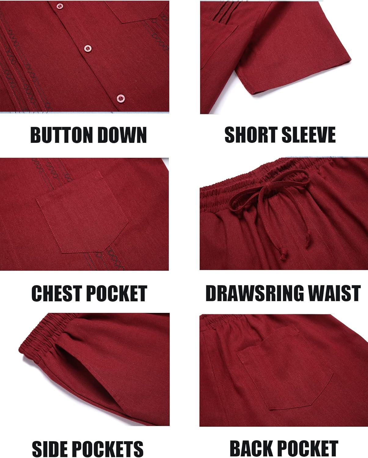 COOFANDY Men Linen Sets Outfits 2 Piece Short Sleeve Cuban Shirts Guayabera Linen Suit(Wine Red)