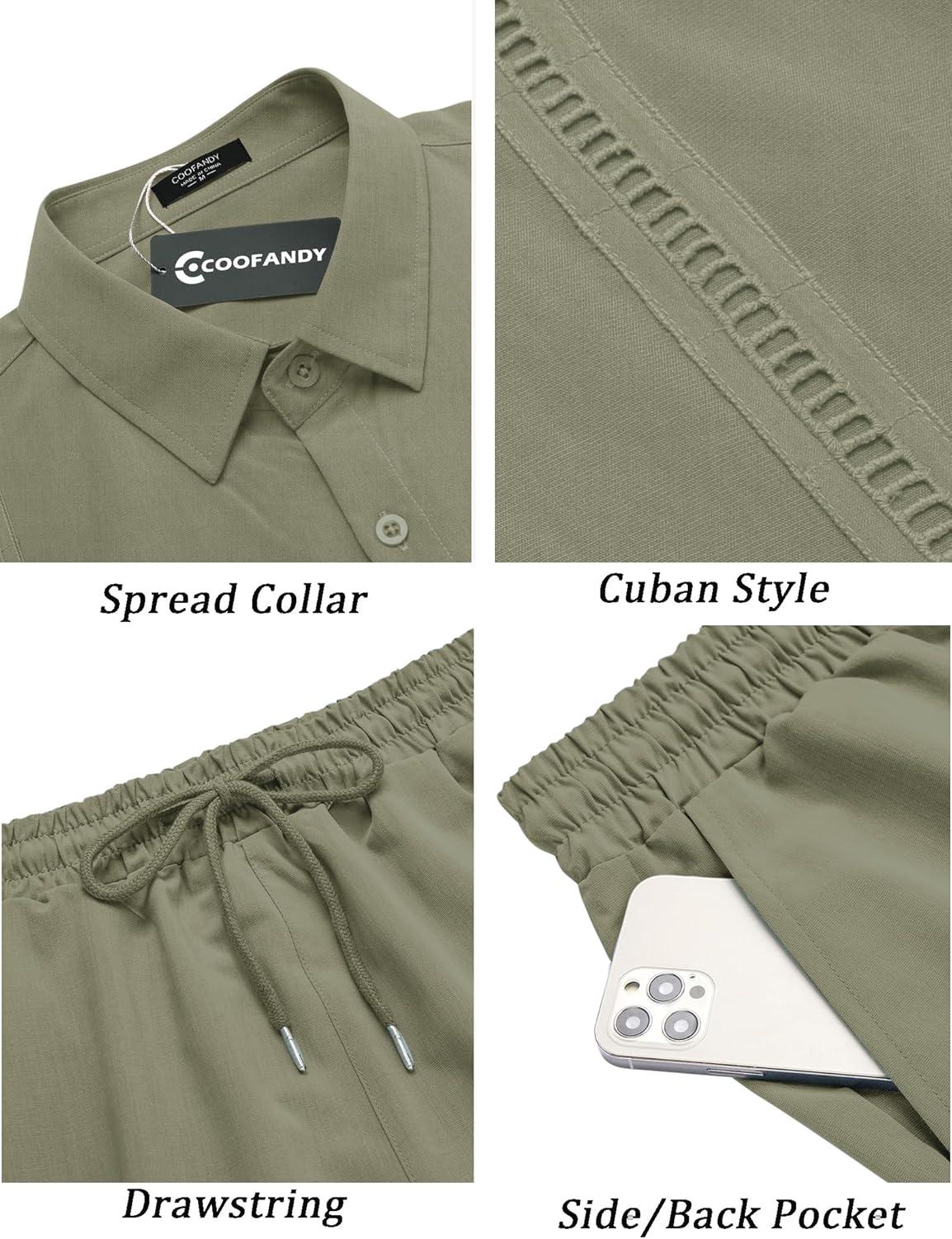 COOFANDY Men Linen Sets Outfits 2 Piece Short Sleeve Cuban Shirts Guayabera Linen Suit(Army Green)