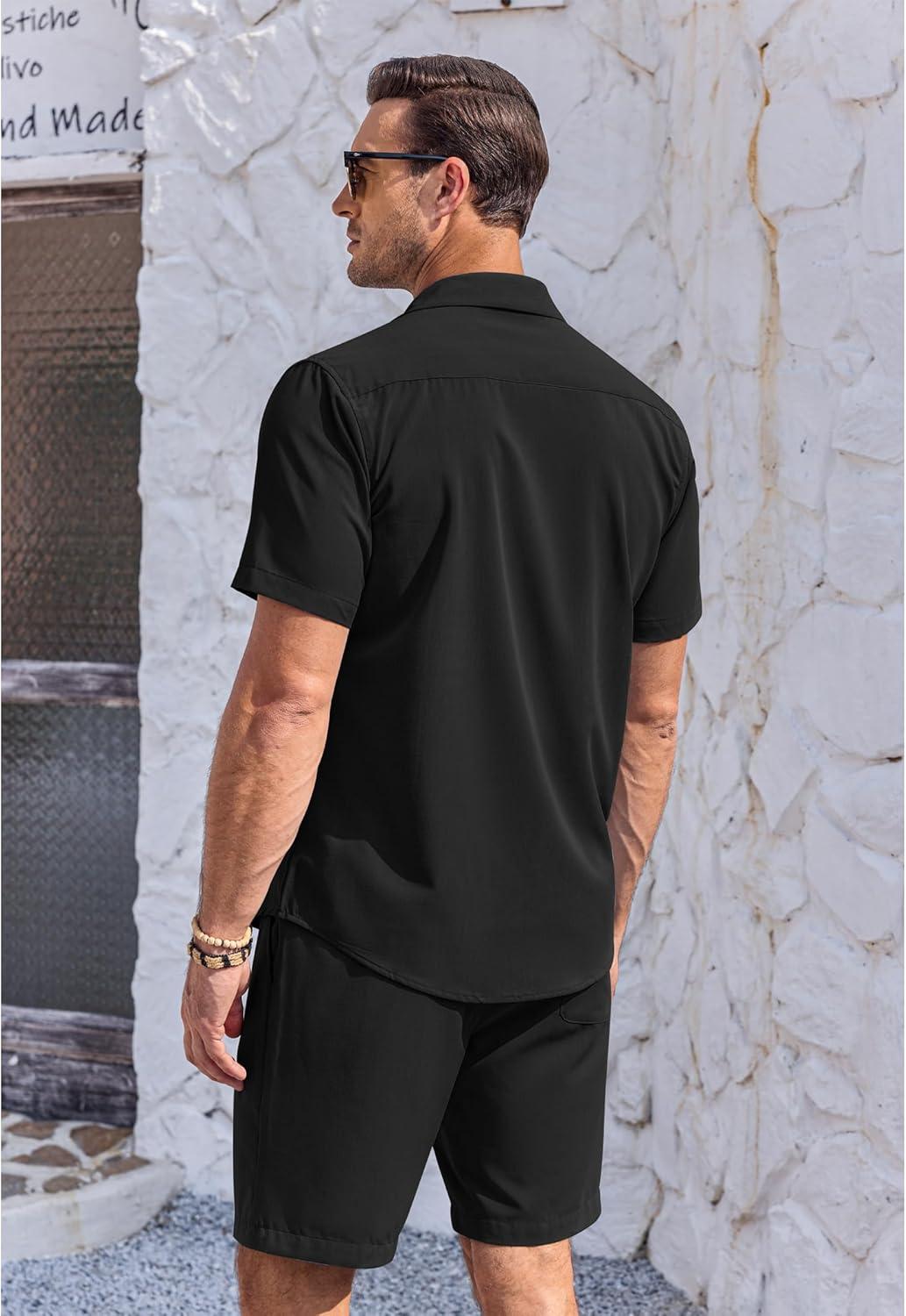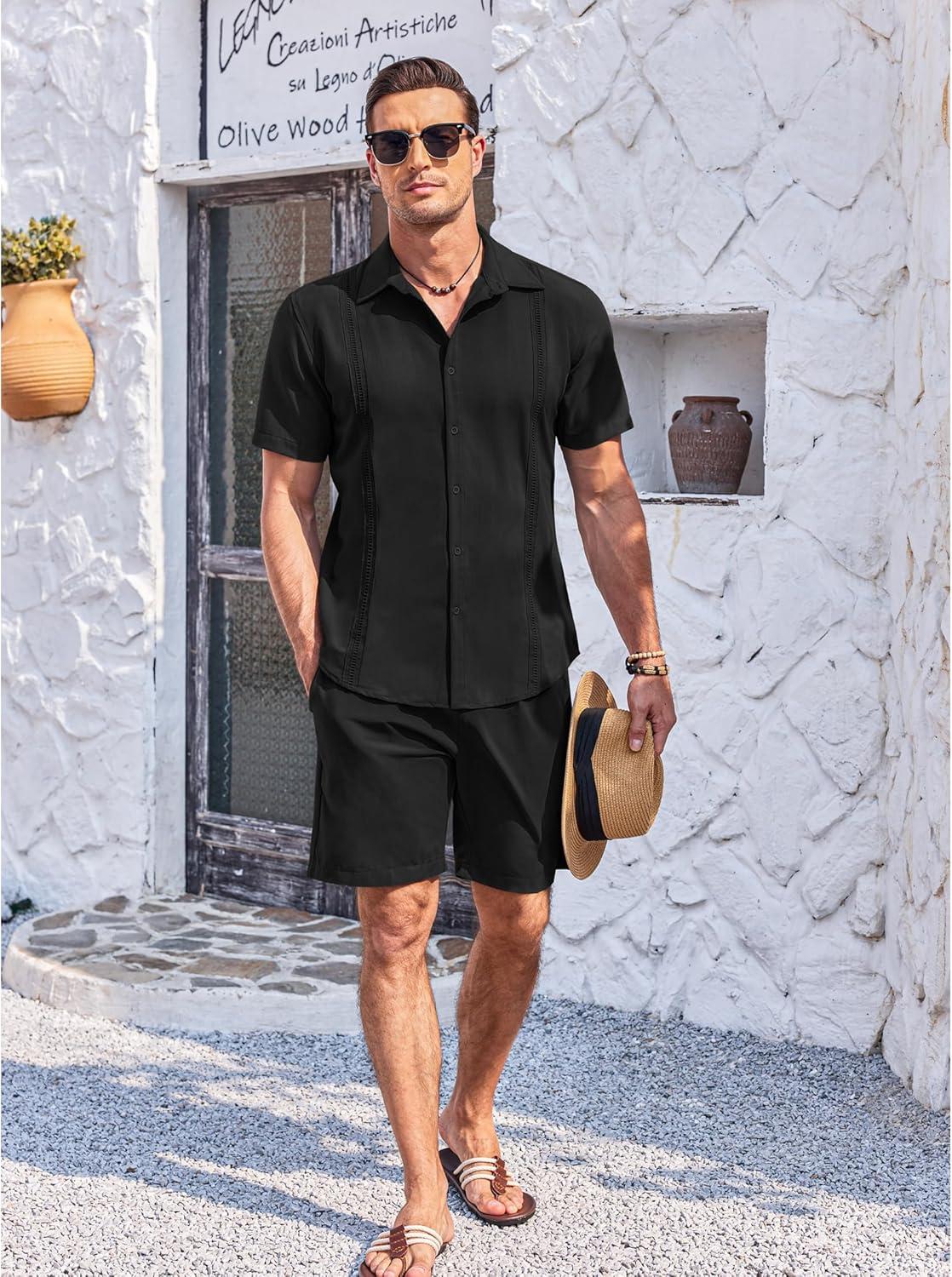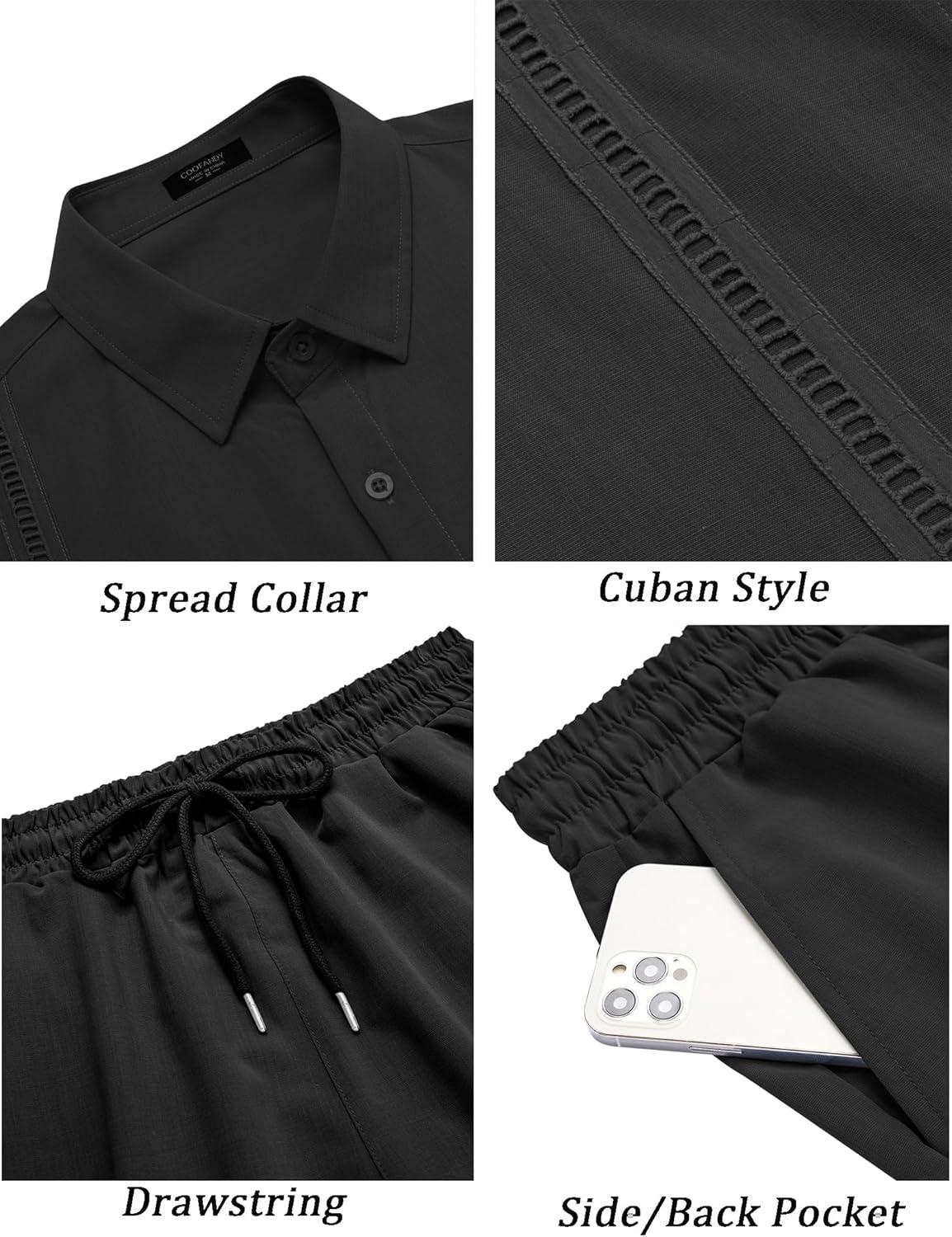COOFANDY Men’s 2 Piece Short Set Cuban Guayabera Shirts Short Sleeve Casual Beach Outfits Set(Black)