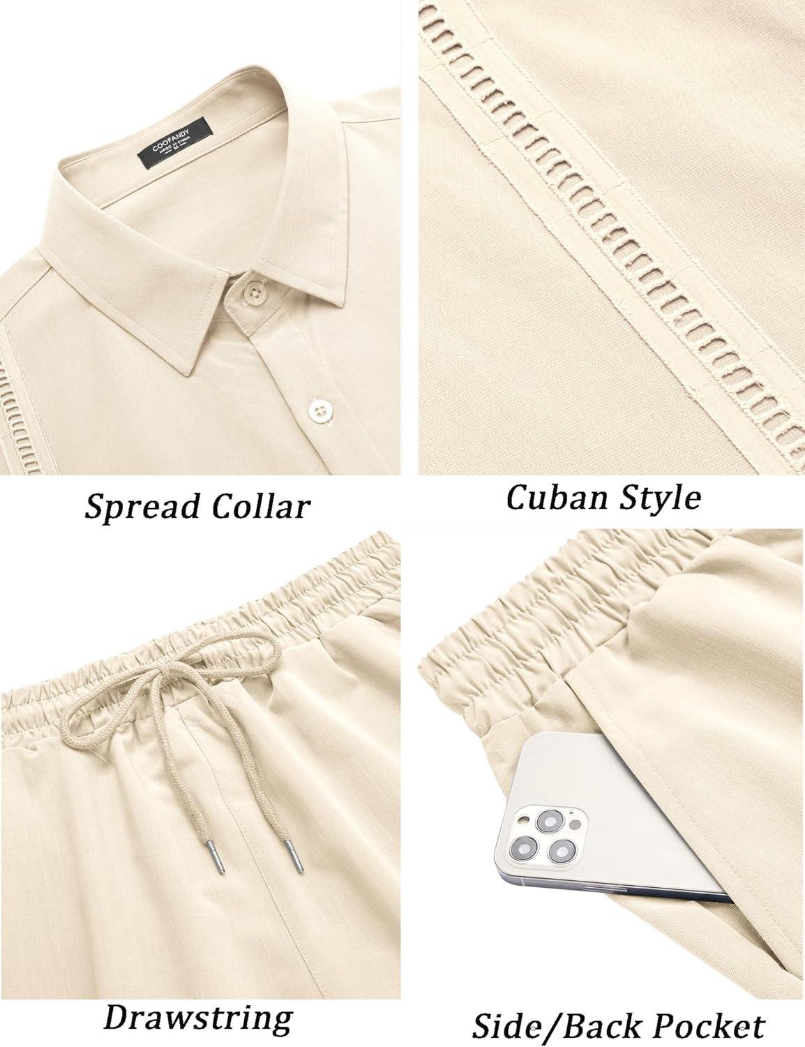 COOFANDY Men Linen Sets Outfits 2 Piece Short Sleeve Cuban Shirts Guayabera Linen Suit(Light Khaki)