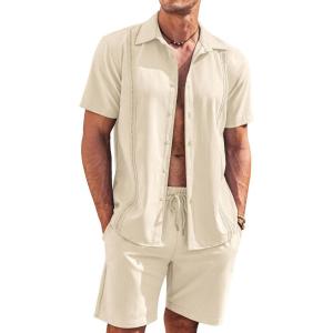 COOFANDY Men’s 2 Piece Short Set Cuban Guayabera Shirts Short Sleeve Casual Beach Outfits Set(Khaki)