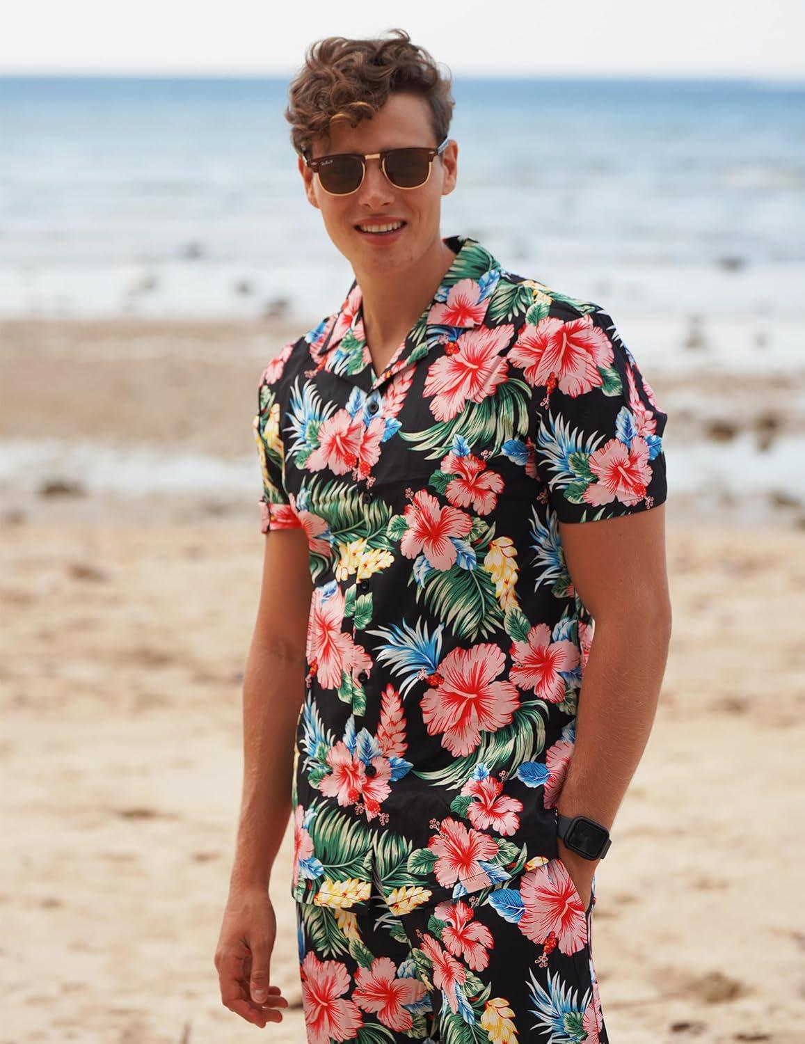 COOFANDY Men’s Hawaiian 2 Piece Outfits Summer Beach Matching Set Short Sleeve Floral Shirts and Shorts(Palm Leaf Black)