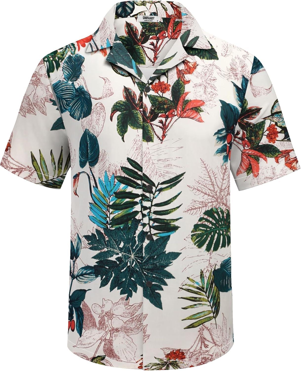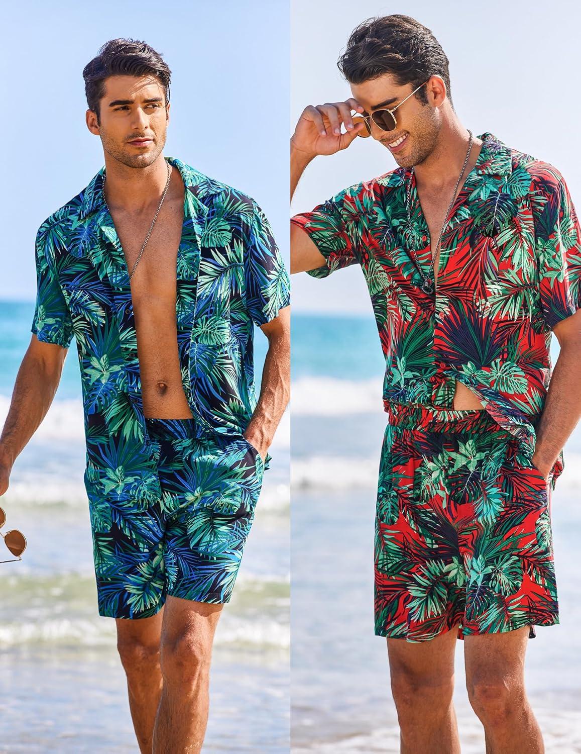 COOFANDY Men’s Hawaiian 2 Piece Outfits Summer Beach Matching Set Short Sleeve Floral Shirts and Shorts(Leaf Green Red)