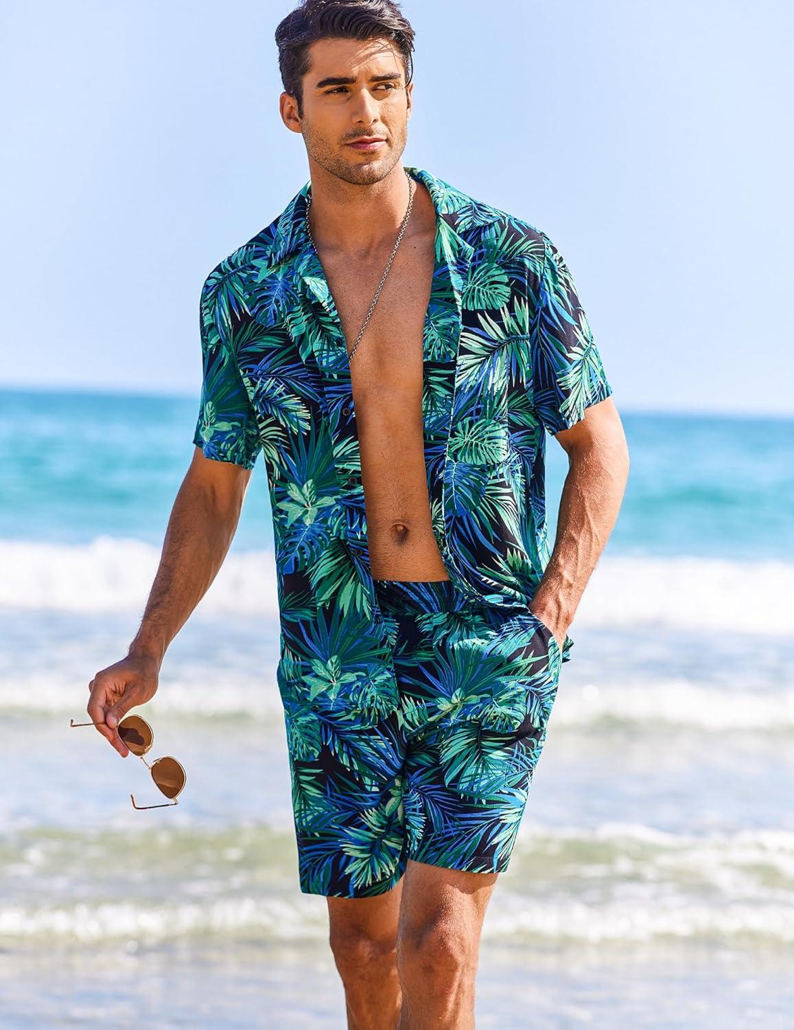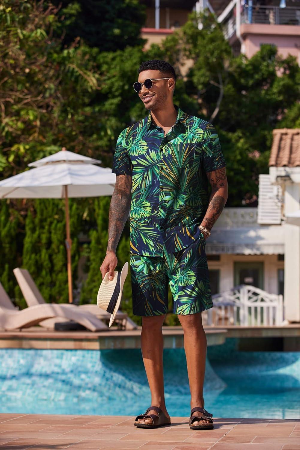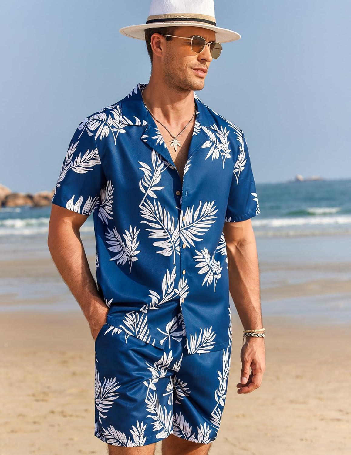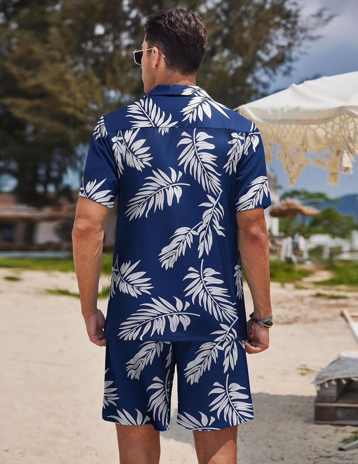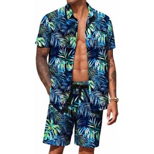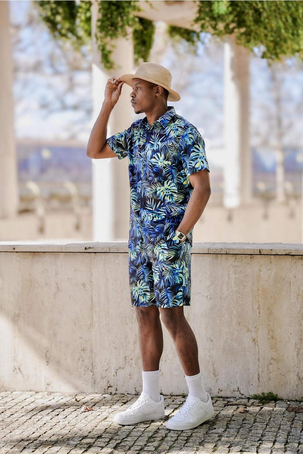 COOFANDY Men’s Hawaiian 2 Piece Outfits Summer Beach Matching Set Short Sleeve Floral Shirts and Shorts(Palm Leaf Blue)