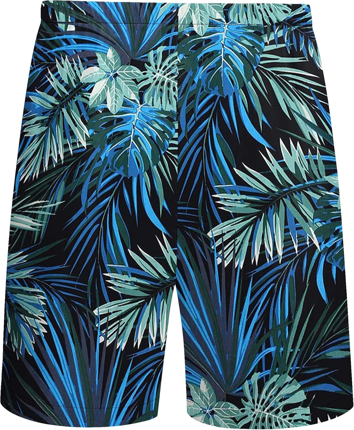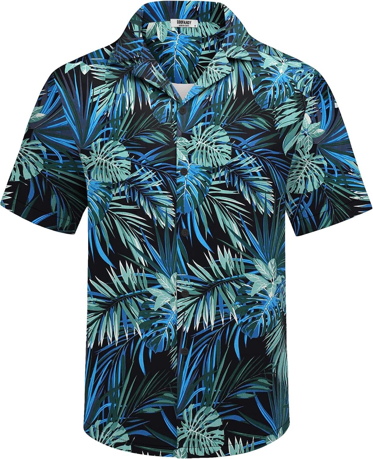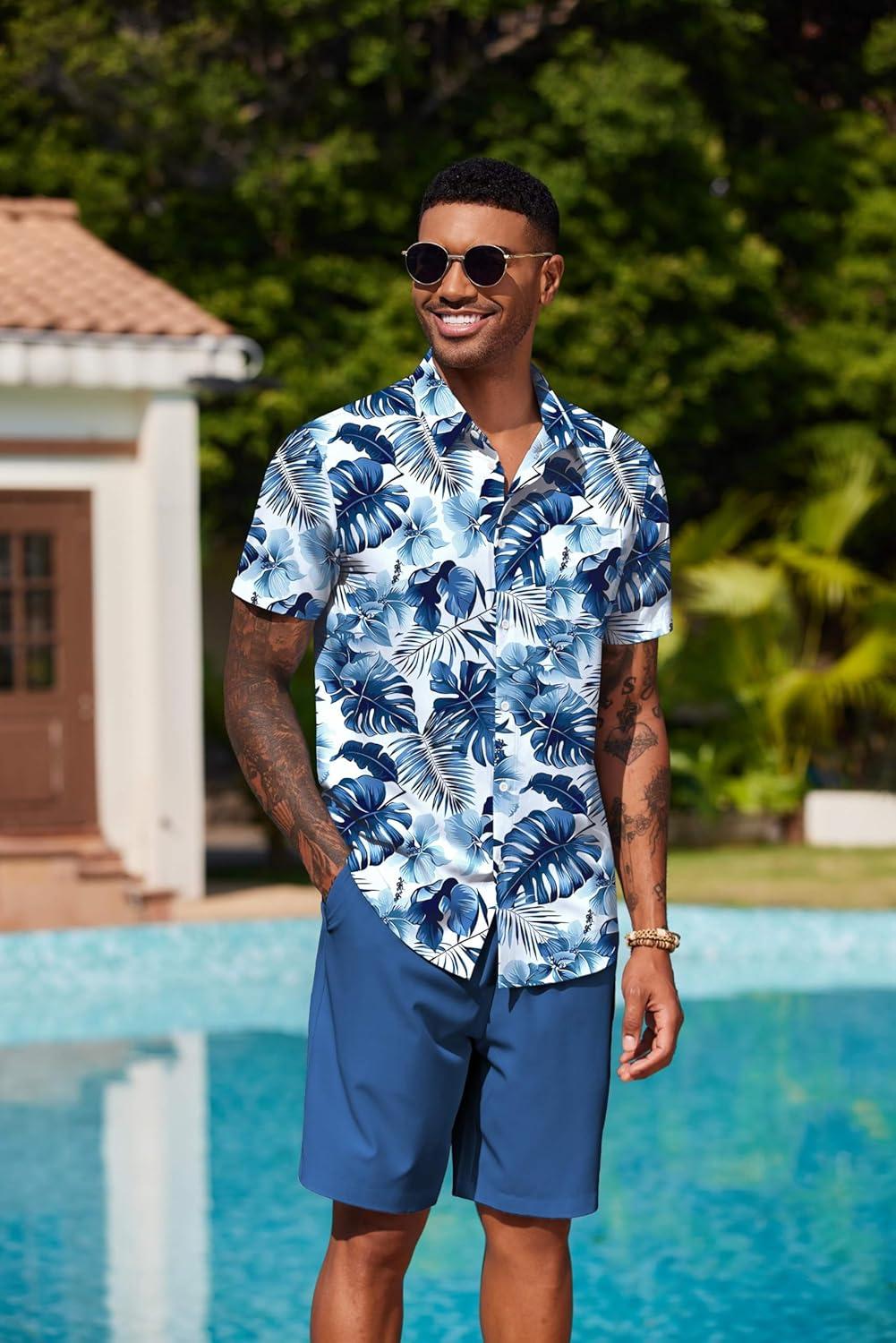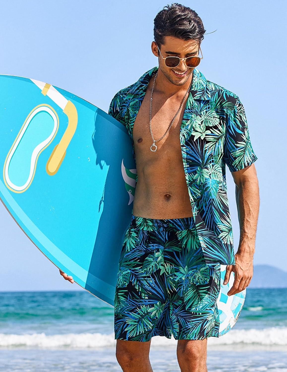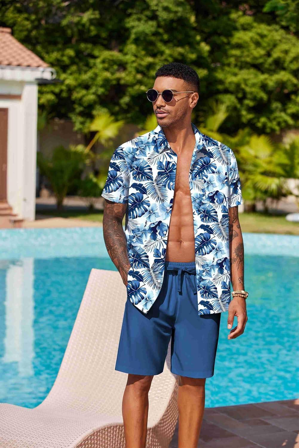 COOFANDY Men’s Hawaiian 2 Piece Outfits Summer Beach Matching Set Short Sleeve Floral Shirts and Shorts(Palm Leaf Blue)