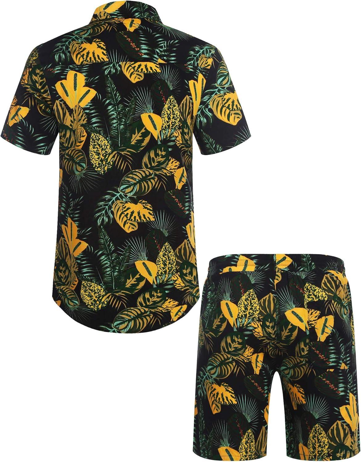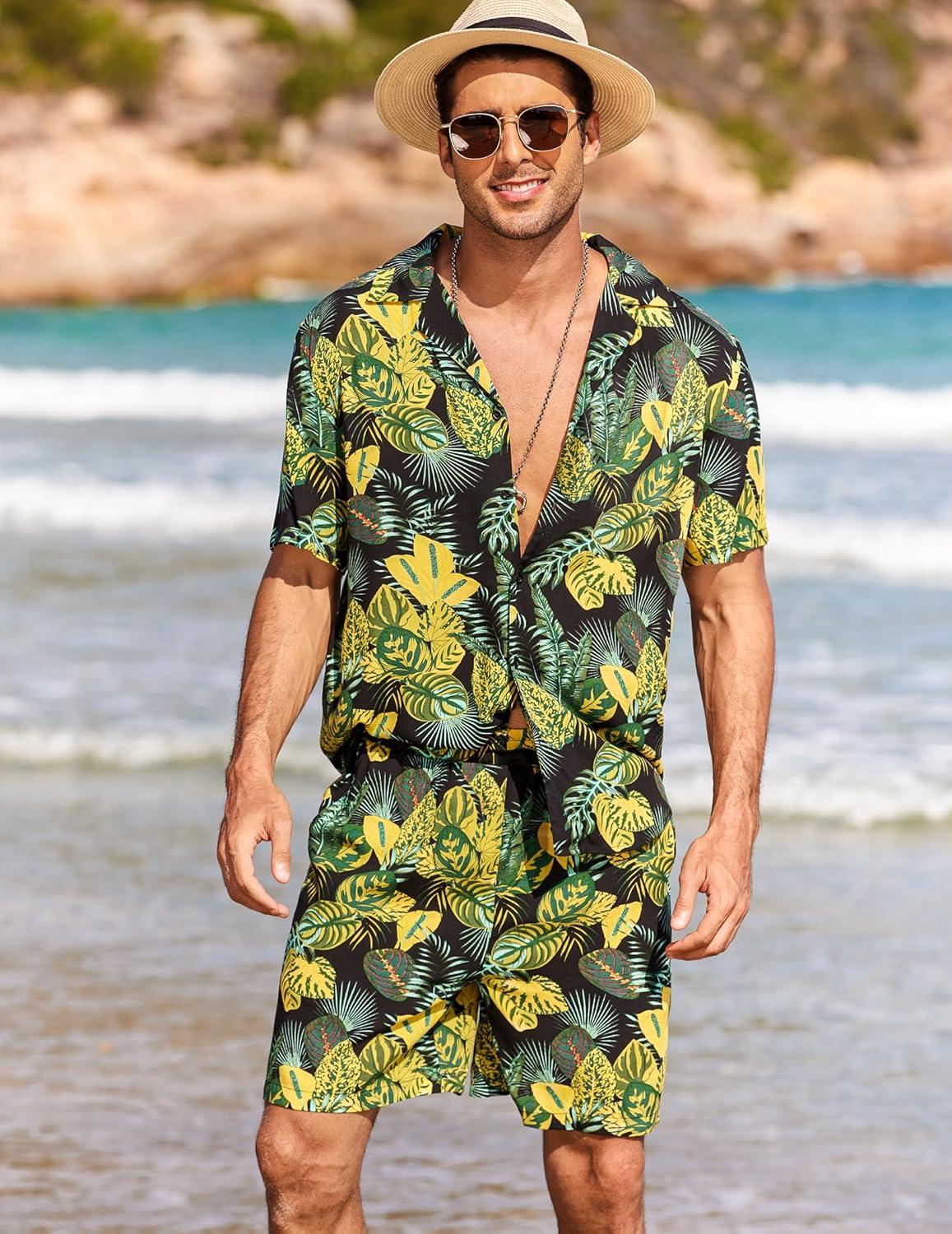 COOFANDY Men’s Hawaiian Matching Shirt and Shorts Set Summer Beach 2 Piece Outfits Short Sleeve Cuban Shirts and Shorts(Rainforest-yellow)