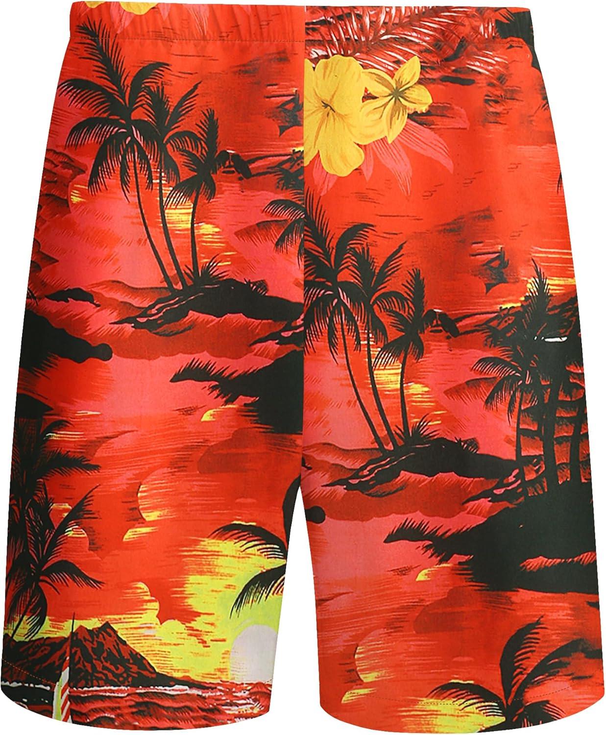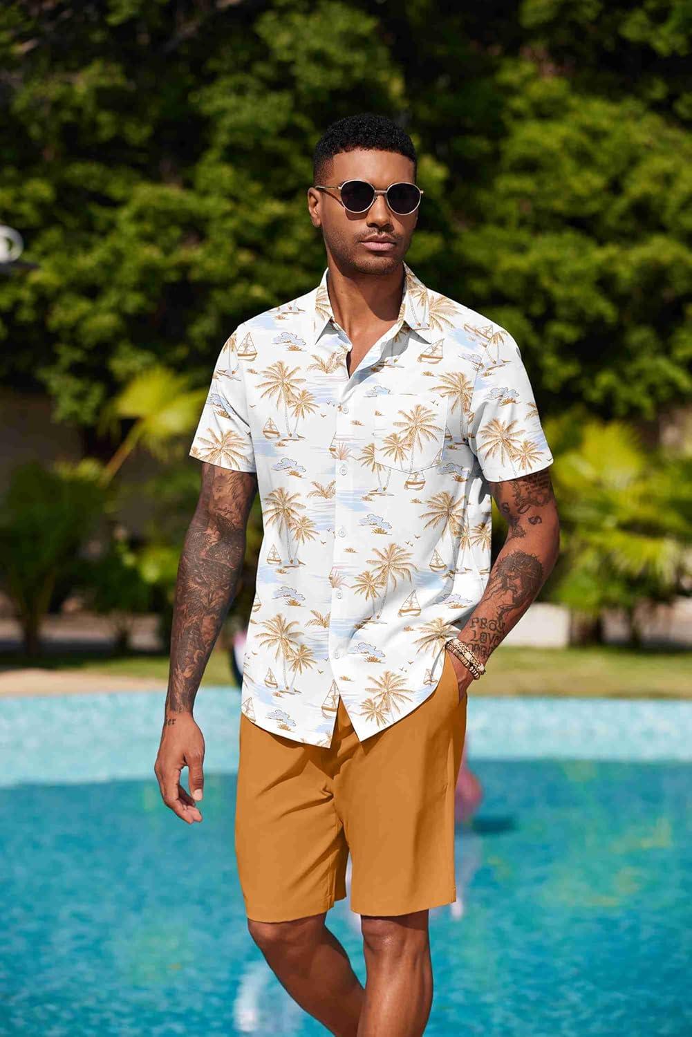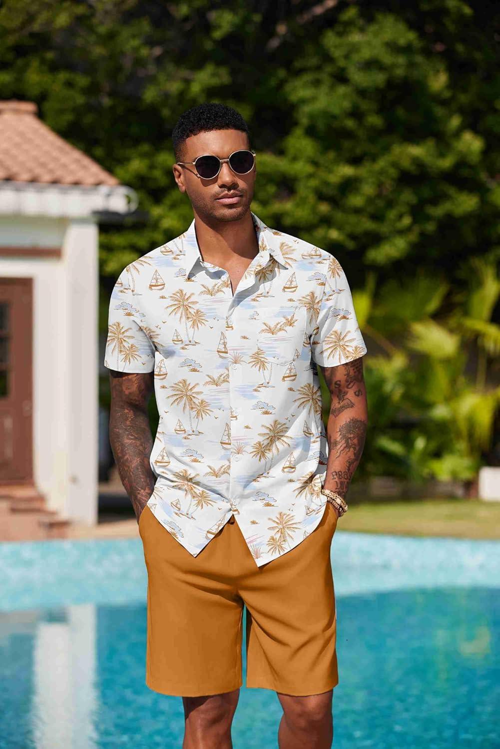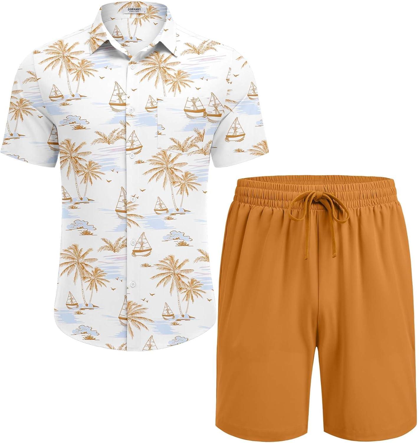 COOFANDY Men’s Hawaiian 2 Piece Outfits Summer Beach Matching Set Short Sleeve Floral Shirts and Shorts(Island Sailboat Orange)