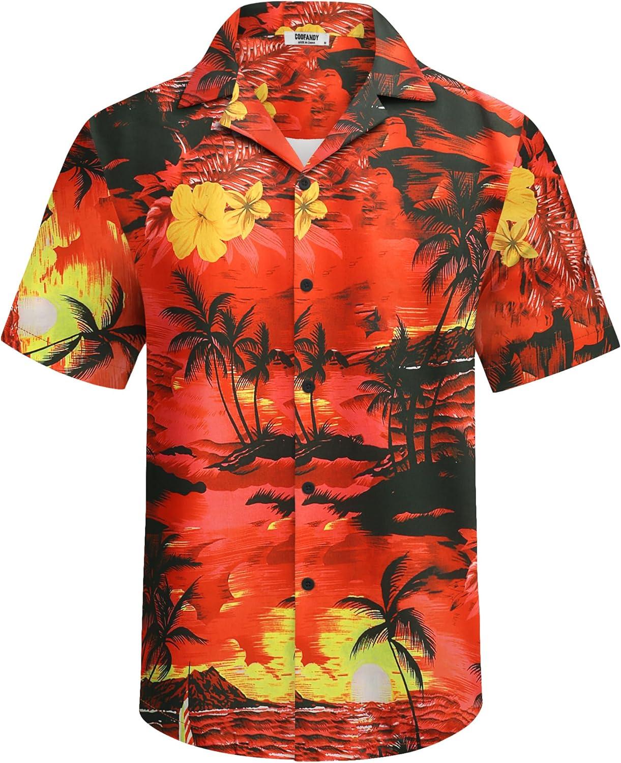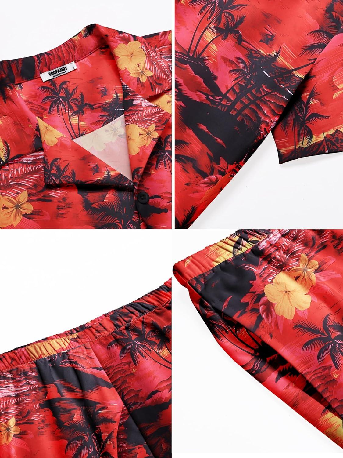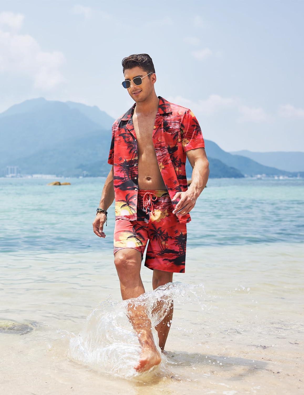 COOFANDY Men’s Hawaiian 2 Piece Outfits Summer Beach Matching Set Short Sleeve Floral Shirts and Shorts(Leaf Red)