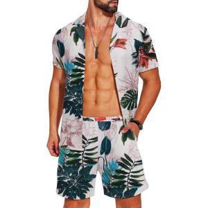 COOFANDY Men’s Hawaiian Matching Shirt and Shorts Set Summer Beach 2 Piece Outfits Short Sleeve Cuban Shirts and Shorts(Leaves-white)