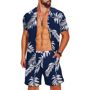 COOFANDY Men’s Hawaiian Matching Shirt and Shorts Set Summer Beach 2 Piece Outfits Short Sleeve Cuban Shirts and Shorts(Leaves-blue)