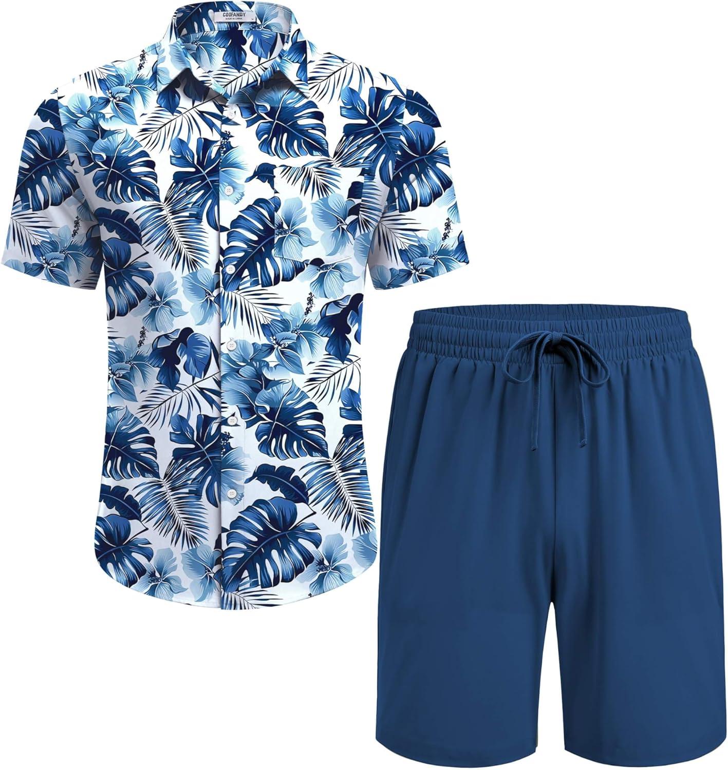 COOFANDY Men’s Hawaiian 2 Piece Outfits Summer Beach Matching Set Short Sleeve Floral Shirts and Shorts(Leaf Blue White)