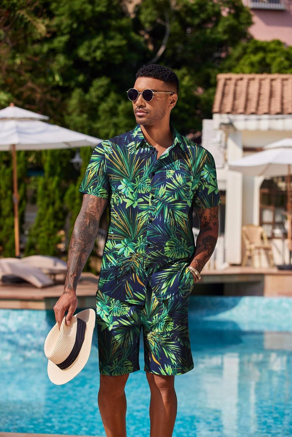 COOFANDY Men’s Hawaiian 2 Piece Outfits Summer Beach Matching Set Short Sleeve Floral Shirts and Shorts(Leaf Green)