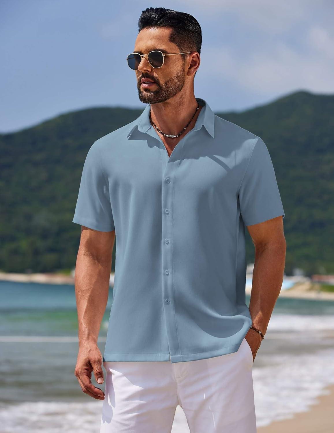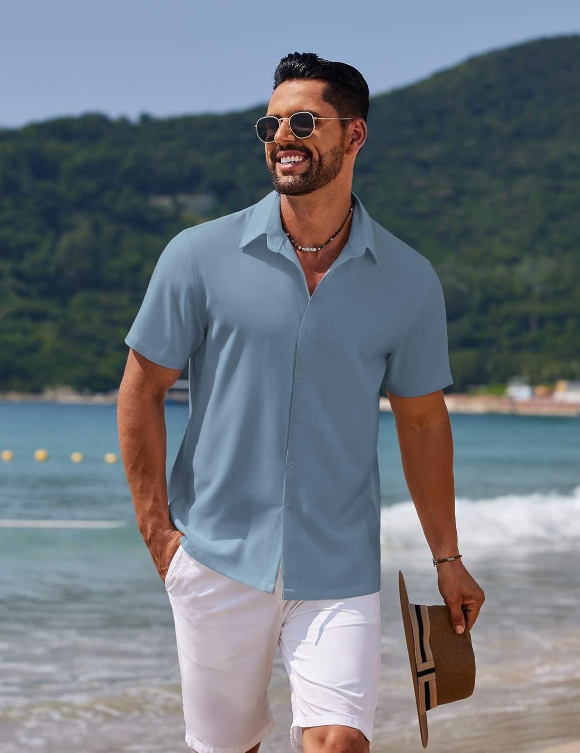 COOFANDY Men’s Casual Short Sleeve Button Down Shirts Untucked Dress Shirts Wrinkle Free Summer Wedding Shirts Solid(Light Blue)