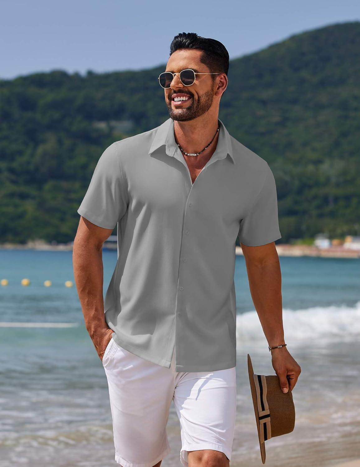 COOFANDY Men’s Knit Shirts Vintage Short Sleeve Button Down Shirt Casual Summer Beach Shirt(Light Gray)