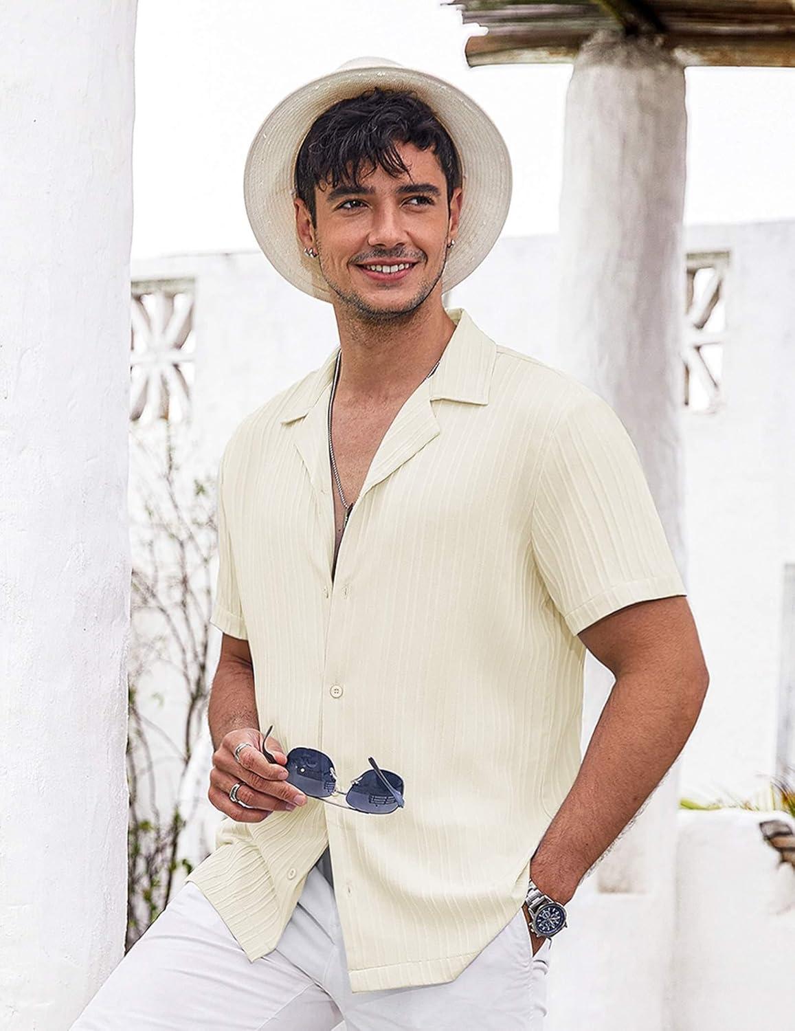 COOFANDY Men’s Knit Shirts Vintage Short Sleeve Button Down Shirt Casual Summer Beach Shirt(Beige)