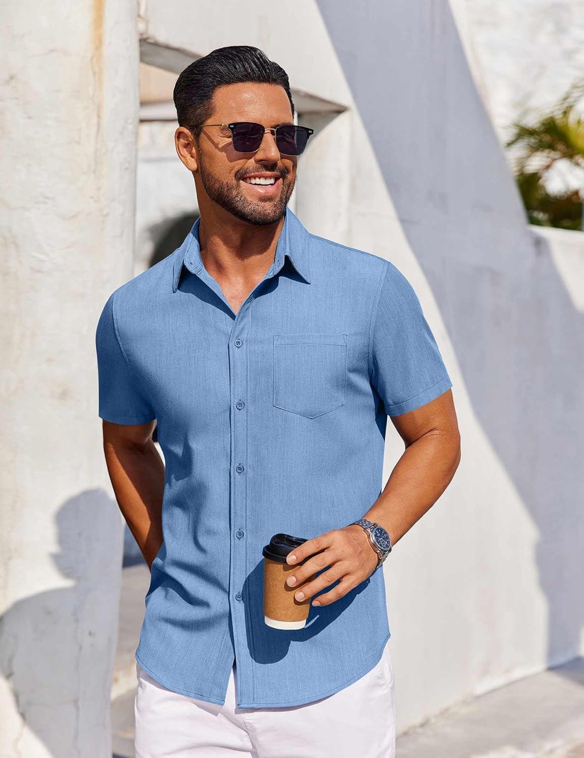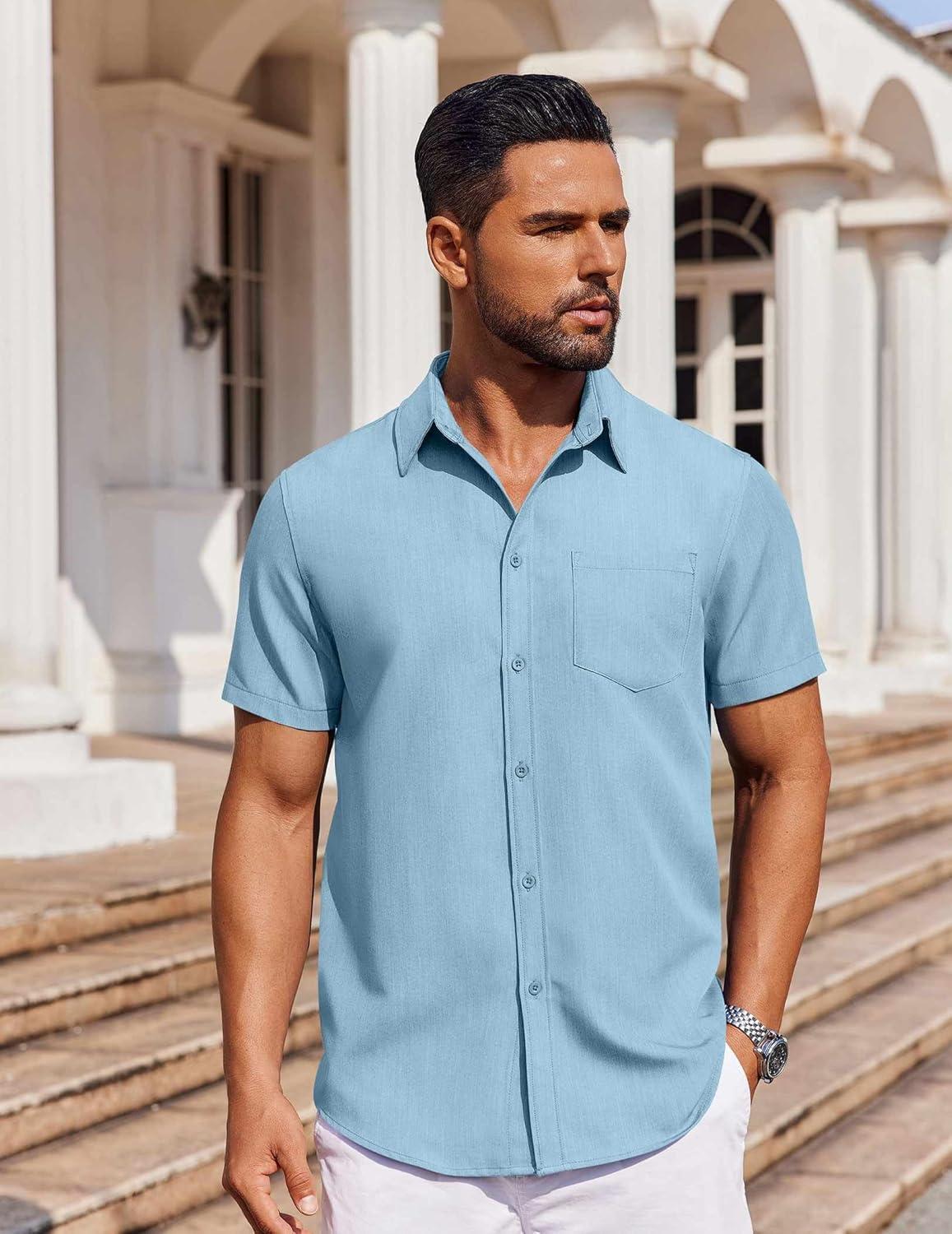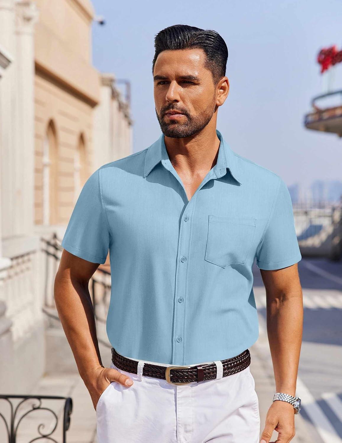 COOFANDY Mens Short Sleeve Button Down Shirts Casual Dress Shirt Untucked Shirts with Pocket(Clear Blue)