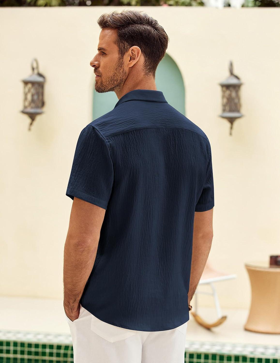 COOFANDY Mens Button Down Short Sleeve Shirt Casual Shirts Summer Beach Textured Shirts with Pocket(Navy Blue)
