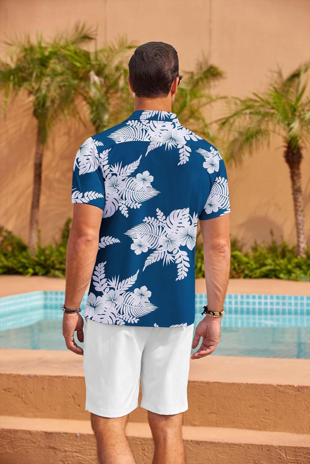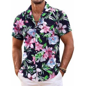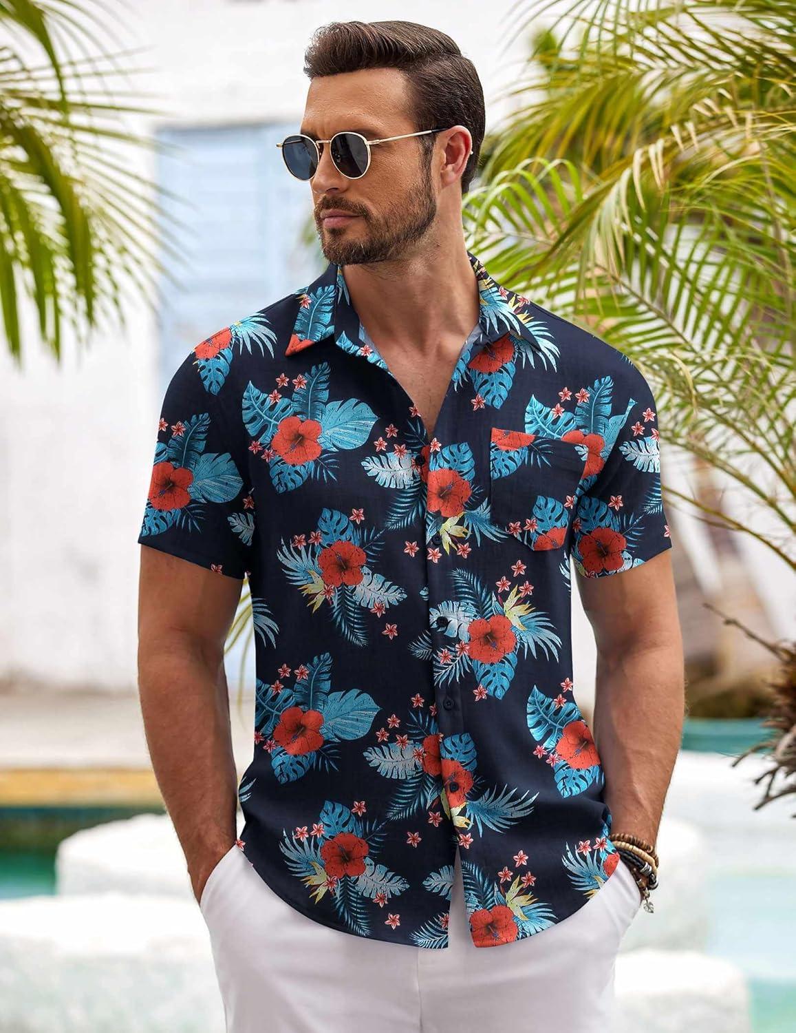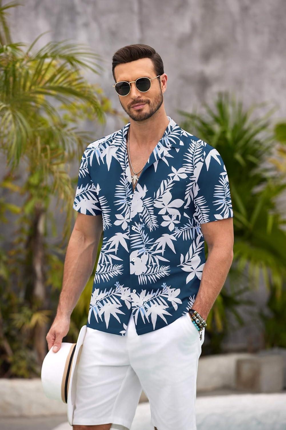 COOFANDY Men’s Hawaiian Shirt Short Sleeve Casual Button Down Tropical Summer Beach Aloha Shirts(Navy-white Flowers)