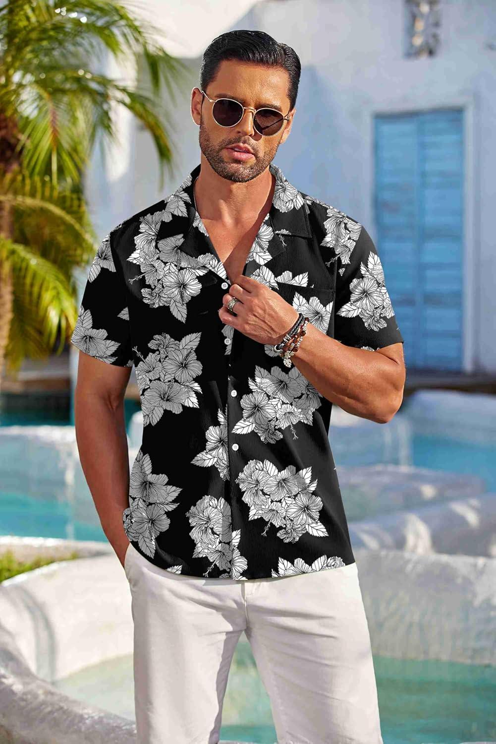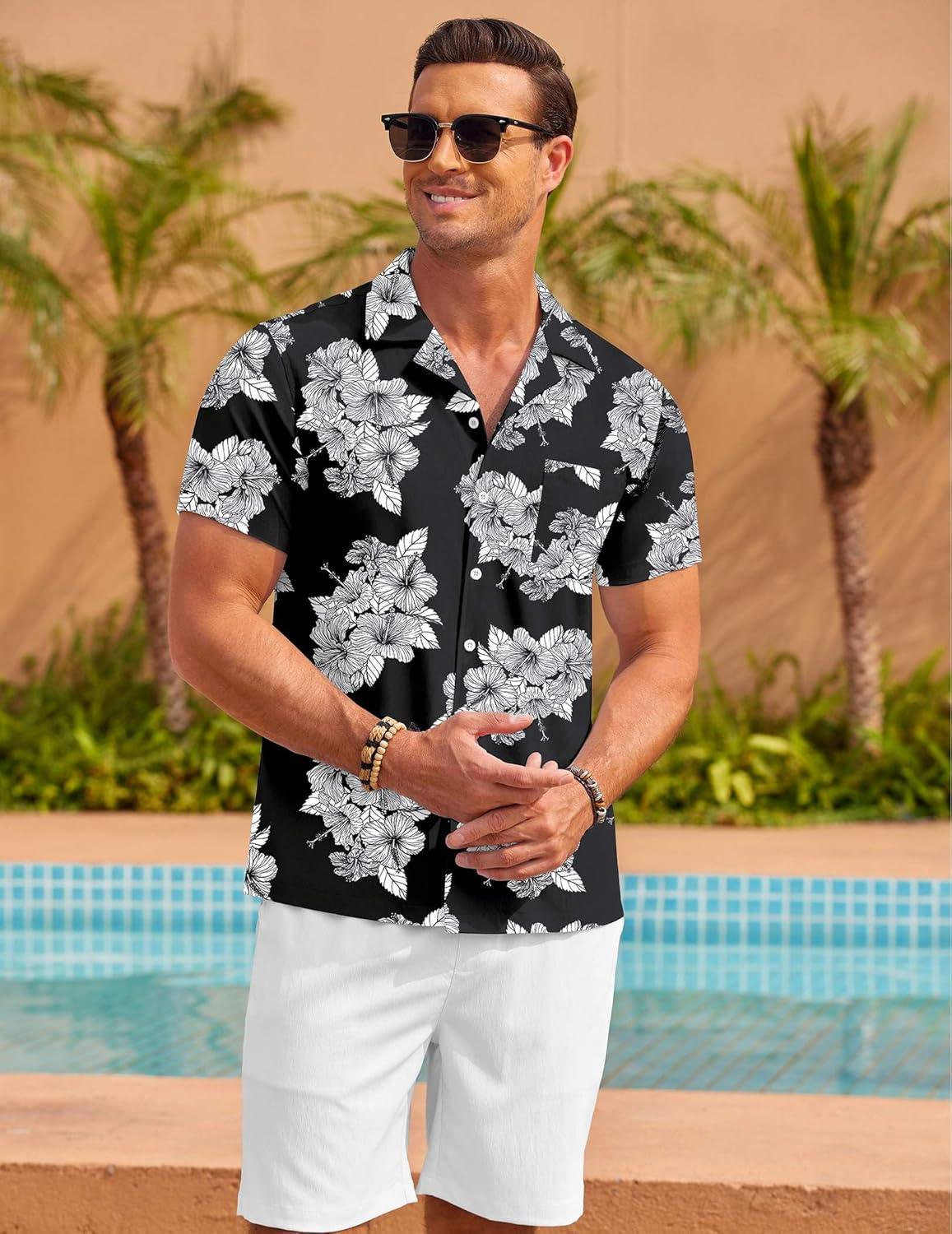 COOFANDY Mens Hawaiian Shirt Short Sleeve Floral Button Down Shirts Tropical Summer Beach Shirts Camp Collar Shirt(Black-white Flower)