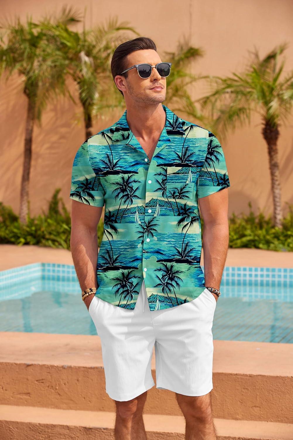 COOFANDY Mens Hawaiian Shirt Short Sleeve Floral Button Down Shirts Tropical Summer Beach Shirts Camp Collar Shirt(Green Palm Tree)