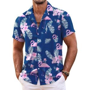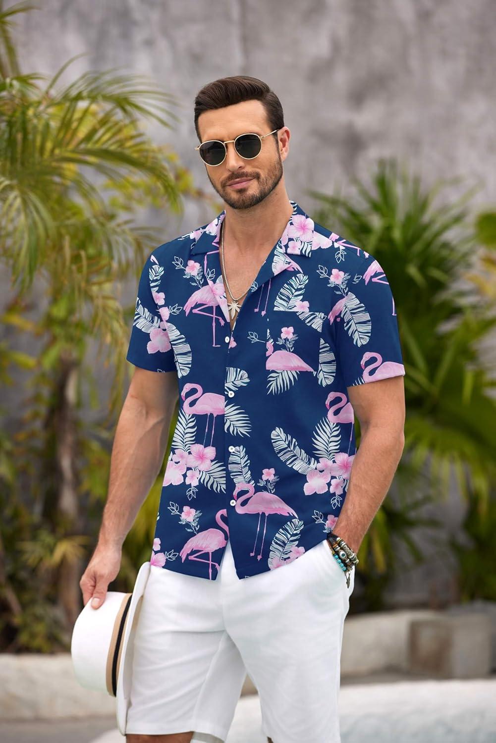 COOFANDY Mens Hawaiian Shirt Short Sleeve Floral Button Down Shirts Tropical Summer Beach Shirts Camp Collar Shirt(Blue-flamingo)