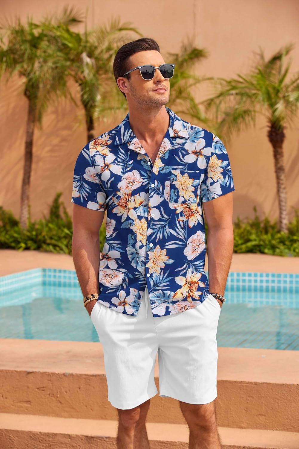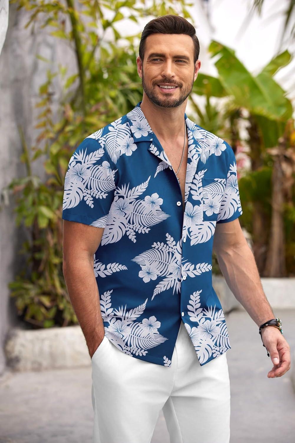 COOFANDY Men’s Hawaiian Shirt Short Sleeve Casual Button Down Tropical Summer Beach Aloha Shirts(Blue-white Flowers)