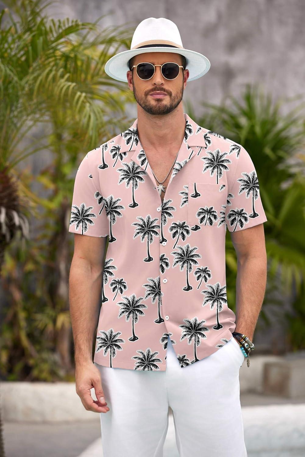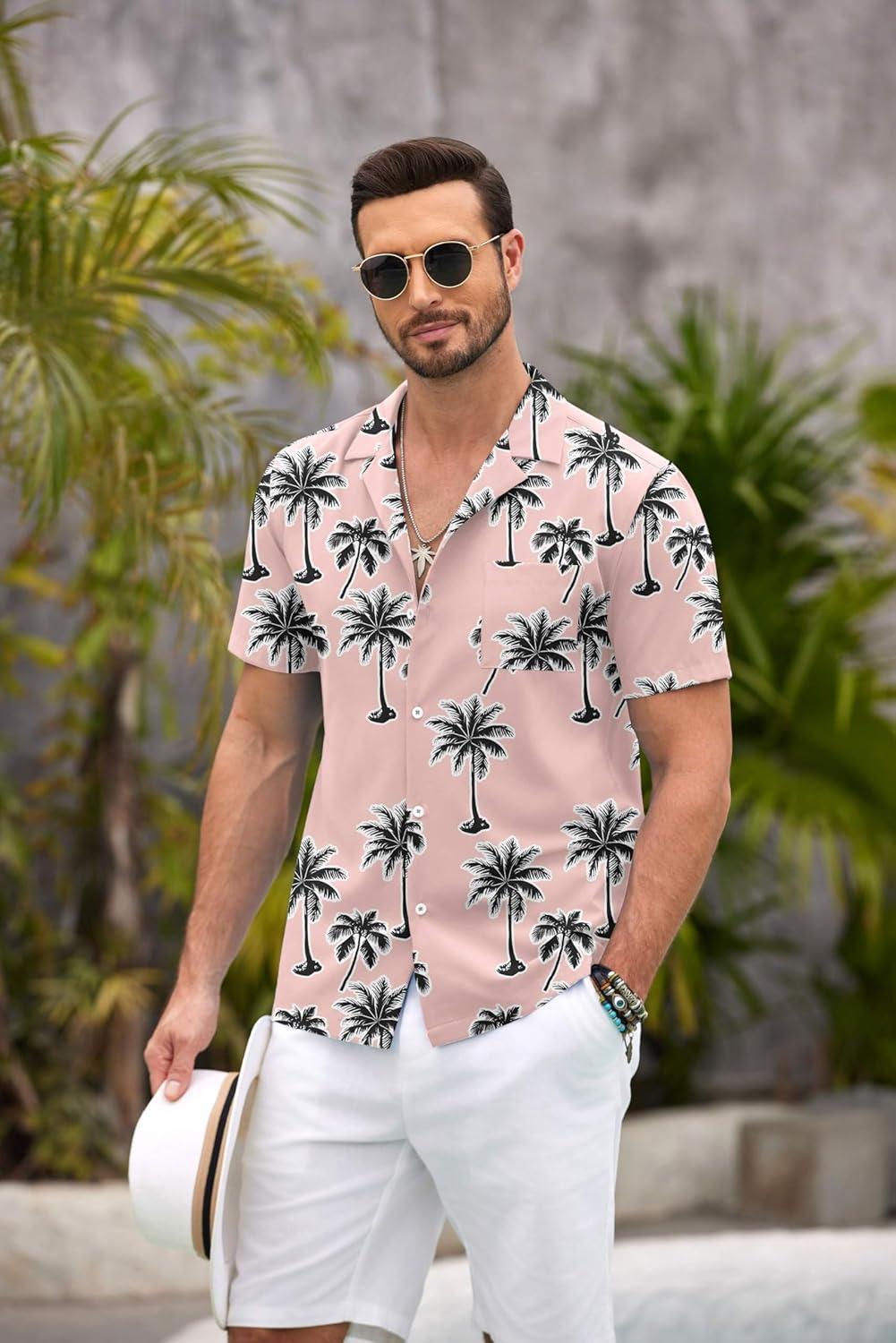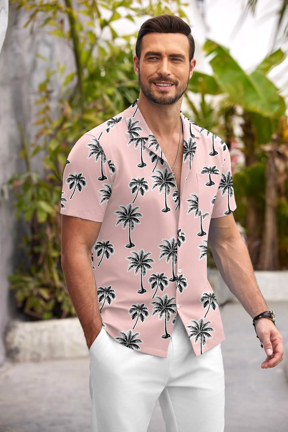 COOFANDY Men’s Hawaiian Shirt Short Sleeve Casual Button Down Tropical Summer Beach Aloha Shirts(Pink-coconut Trees)