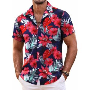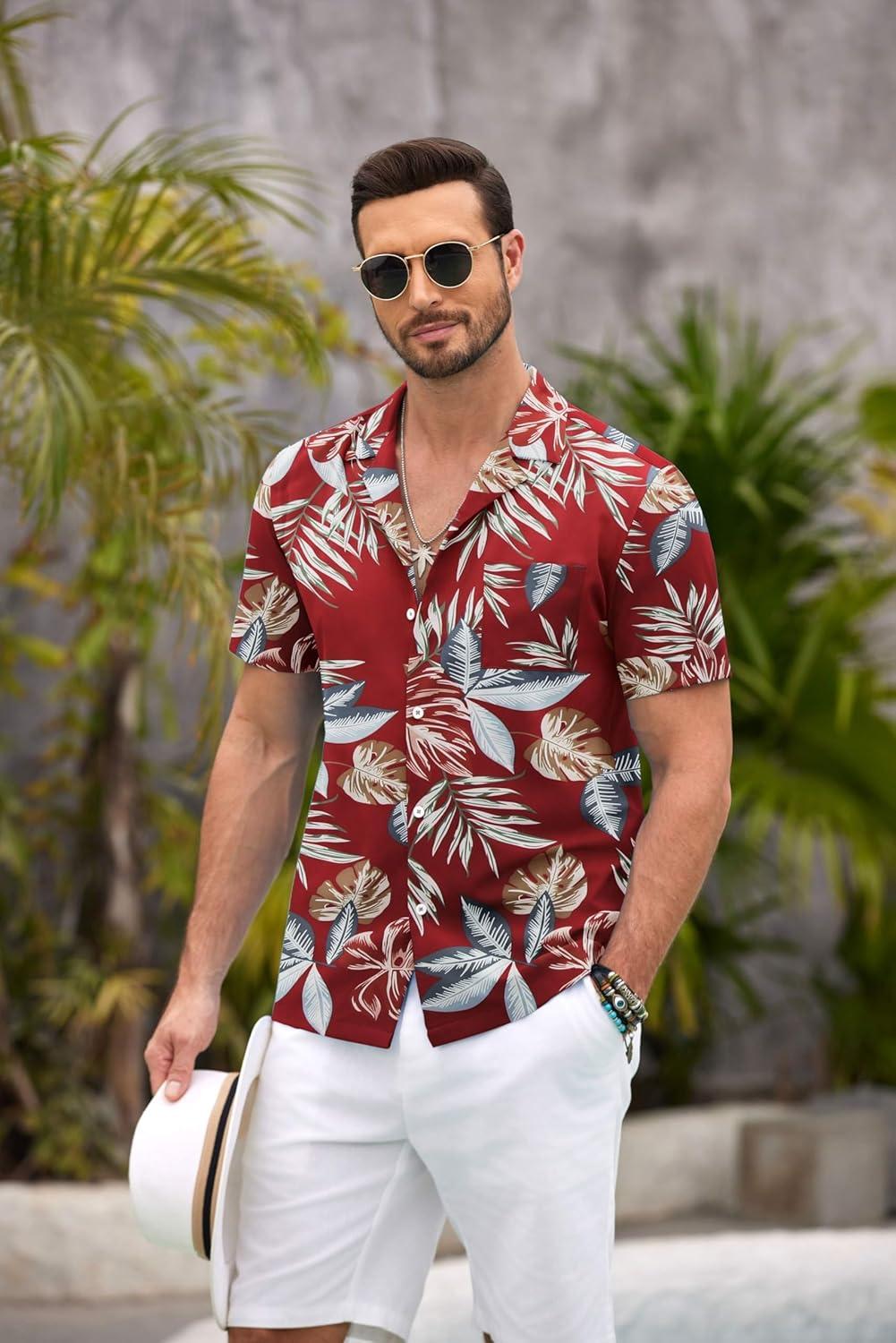 COOFANDY Mens Hawaiian Shirt Short Sleeve Floral Button Down Shirts Tropical Summer Beach Shirts Camp Collar Shirt(Red-leaf)