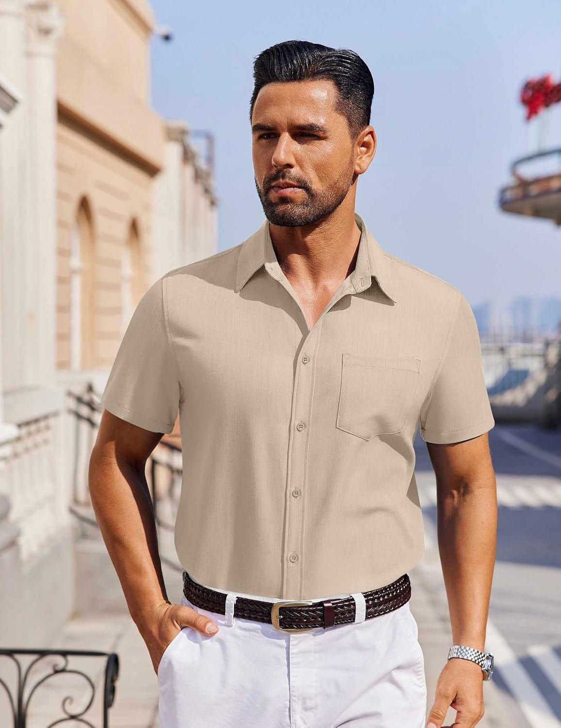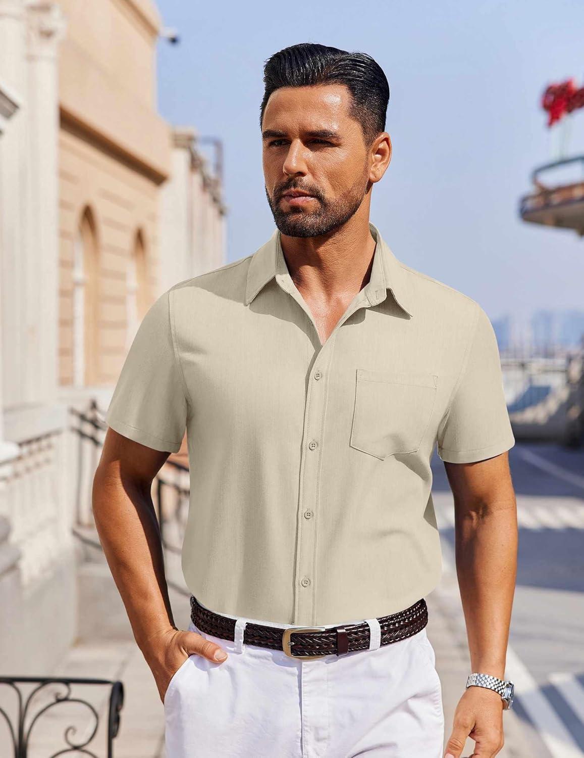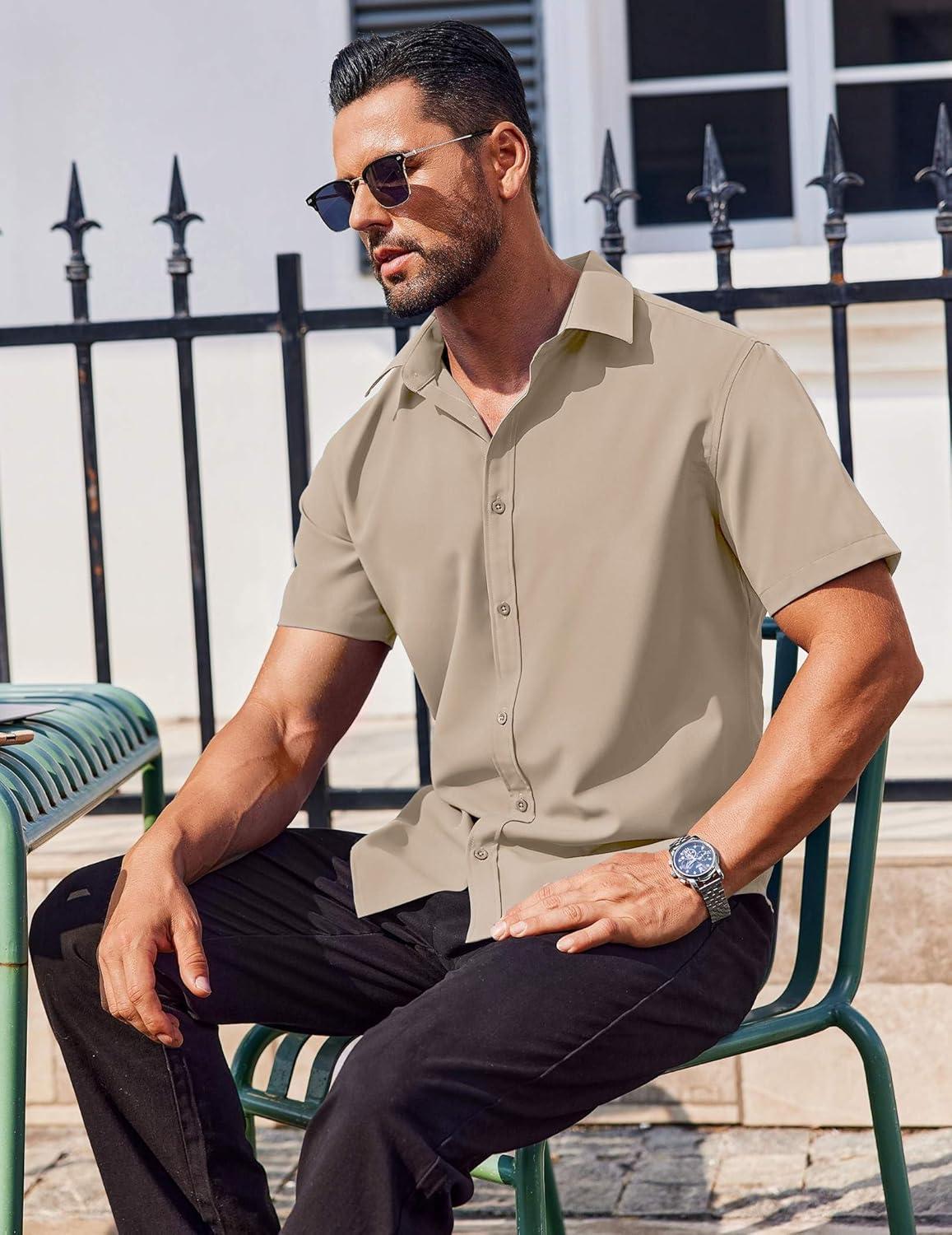 COOFANDY Mens Short Sleeve Dress Shirts Stretch Wrinkle Free Button Down Shirt Casual Summer Top(Khaki)