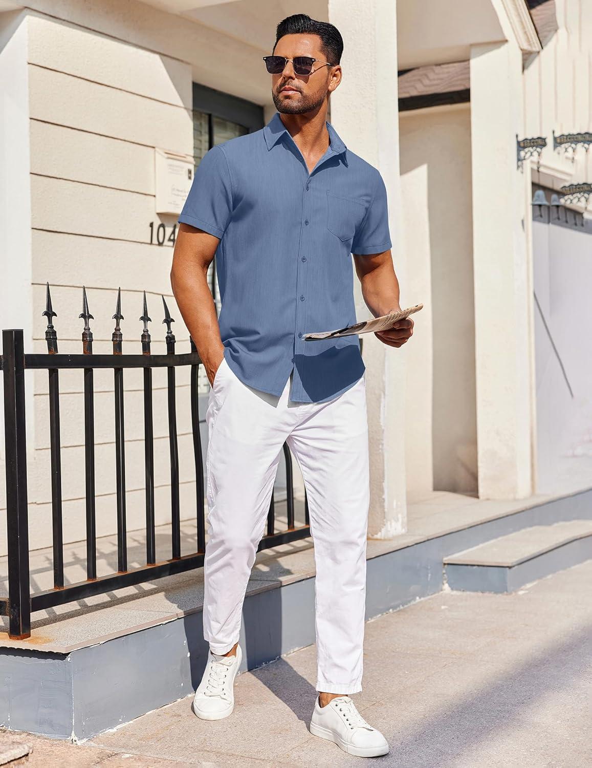COOFANDY Mens Button Down Short Sleeve Shirt Casual Shirts Summer Beach Textured Shirts with Pocket(Beau Blue)
