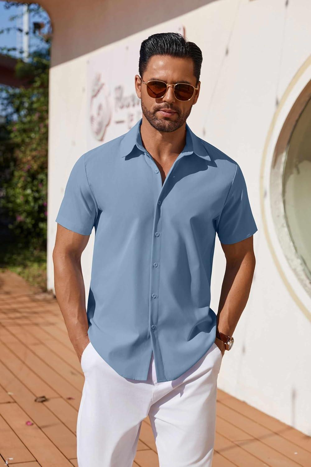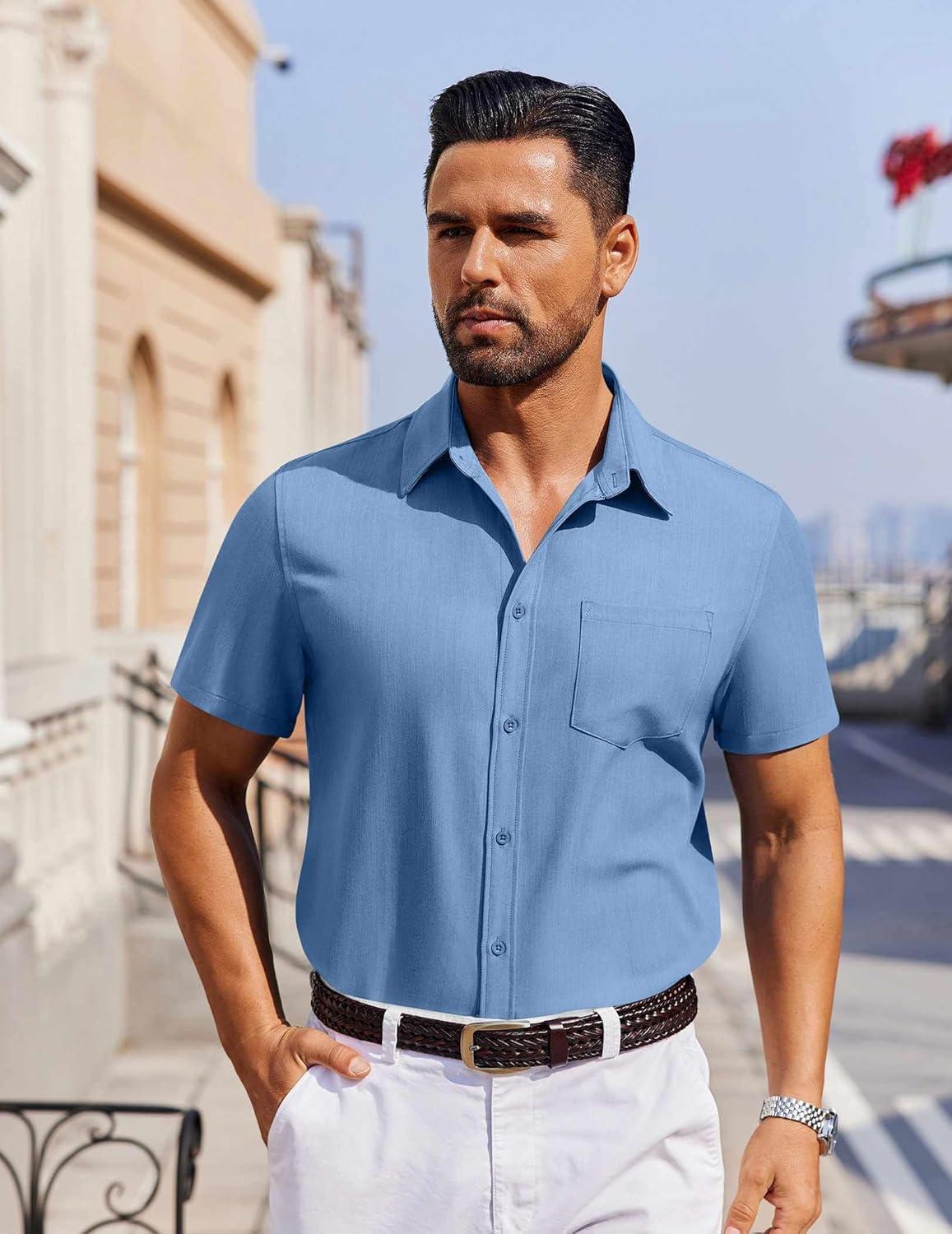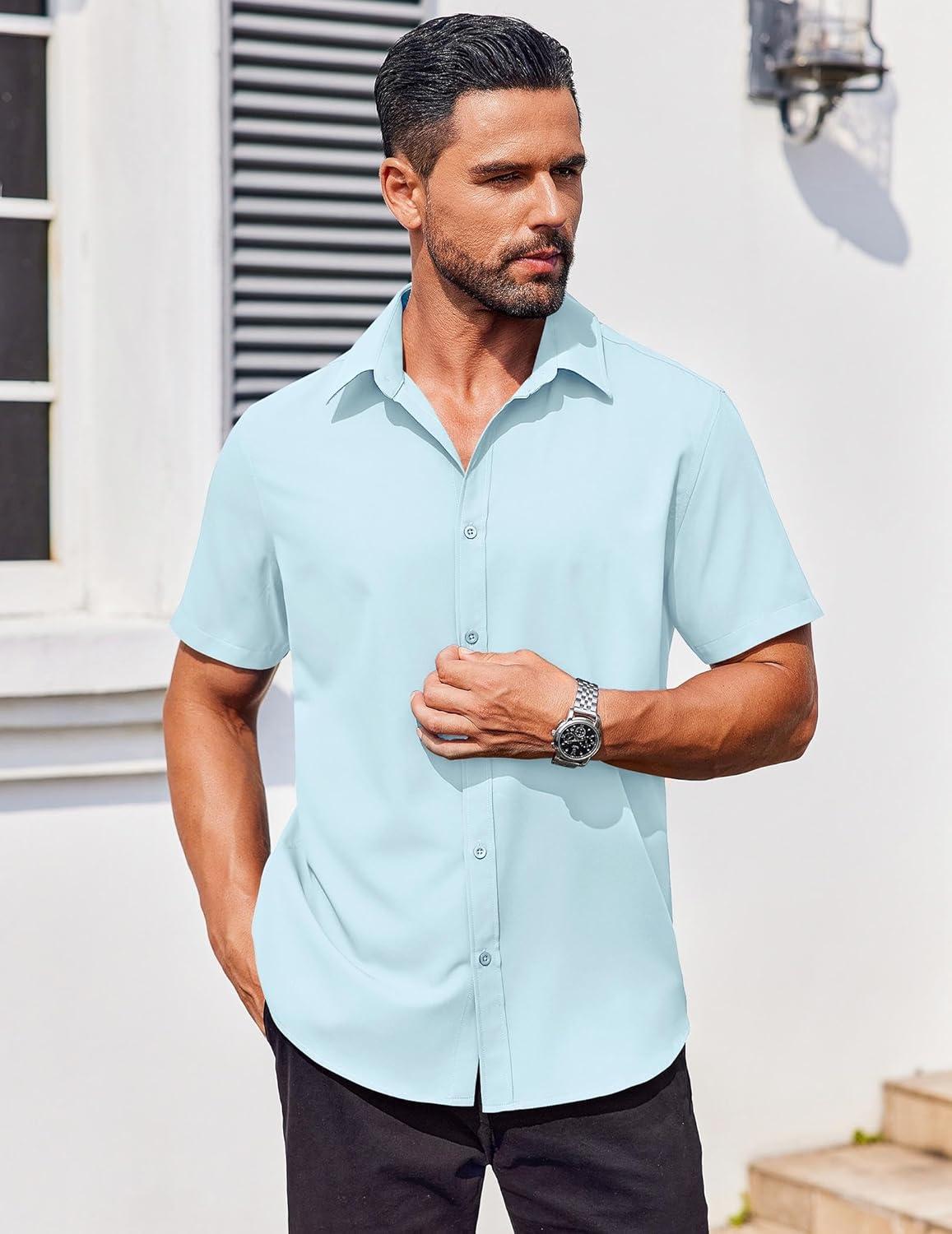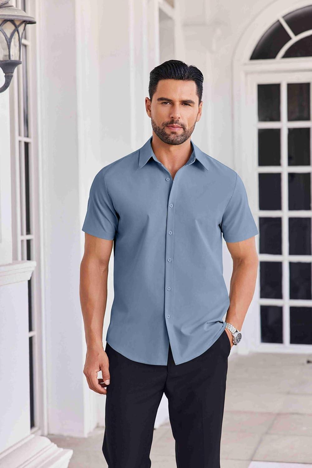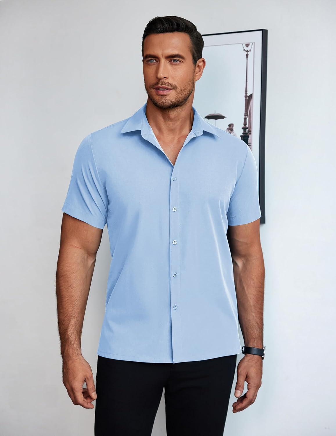 COOFANDY Mens Short Sleeve Dress Shirts Stretch Wrinkle Free Button Down Shirt Casual Summer Top(Blue)