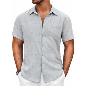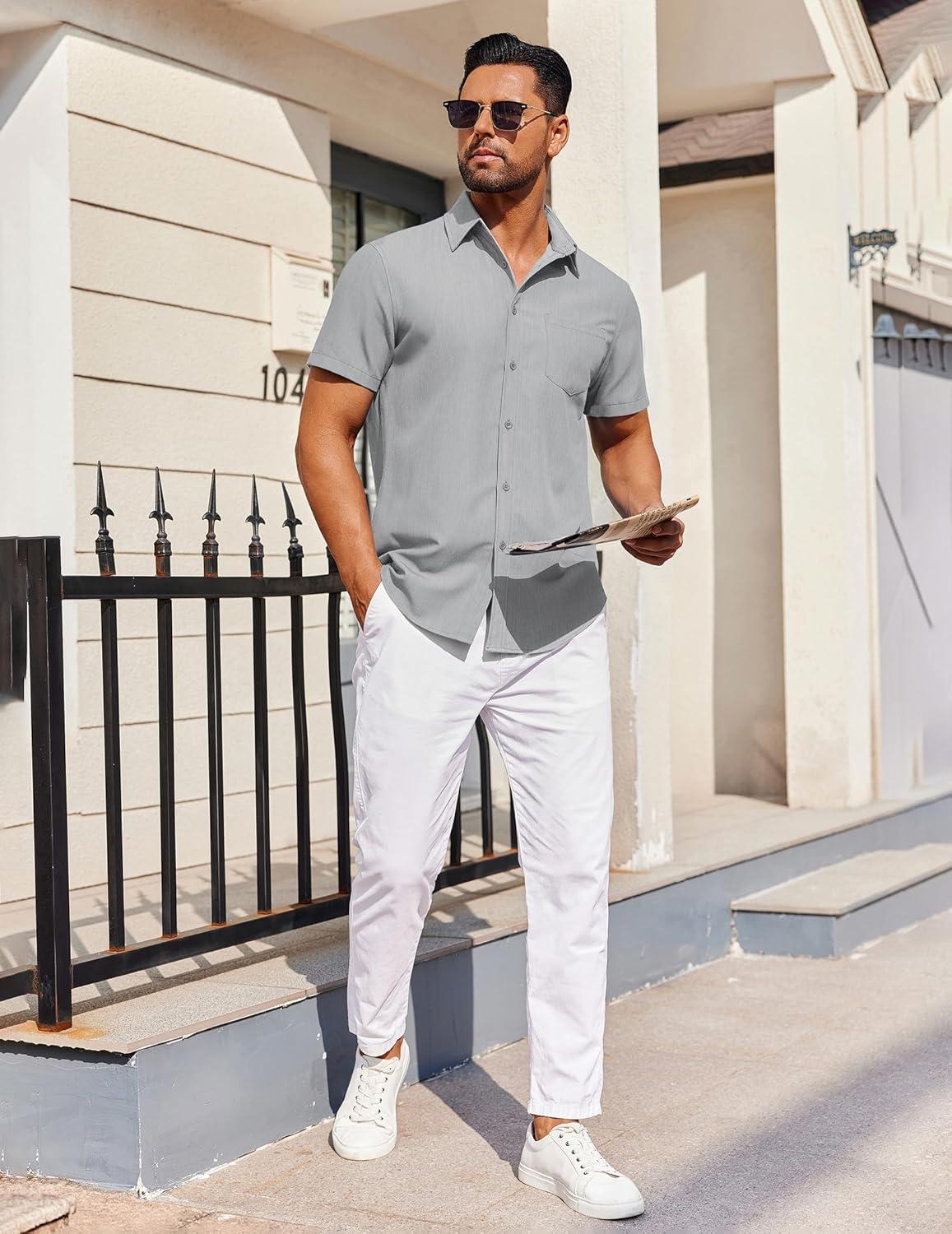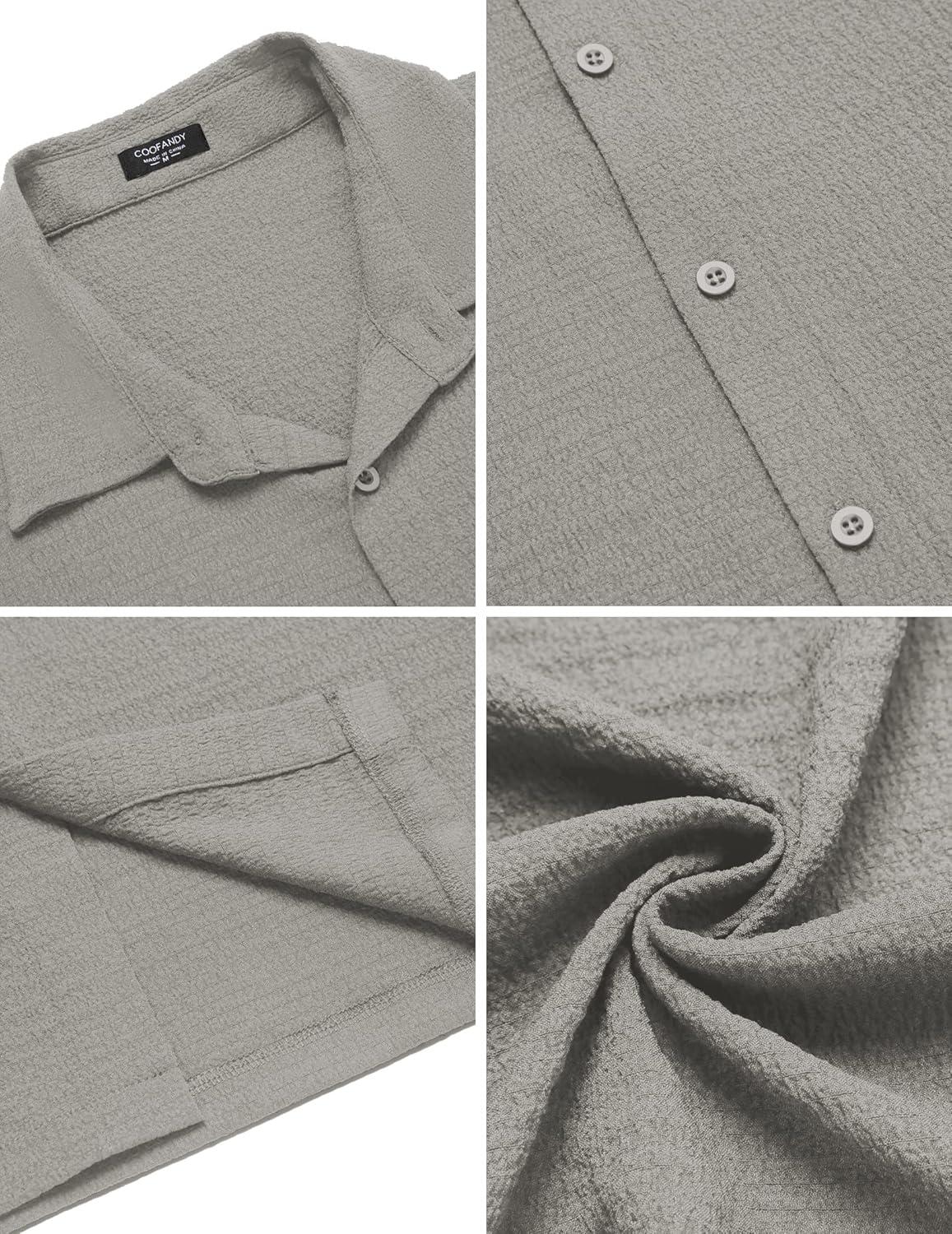 COOFANDY Mens Button Down Short Sleeve Shirt Casual Shirts Summer Beach Textured Shirts with Pocket(Light Grey)