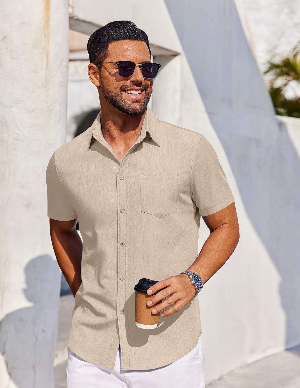 COOFANDY Mens Button Down Short Sleeve Shirt Casual Shirts Summer Beach Textured Shirts with Pocket(Light Khaki)