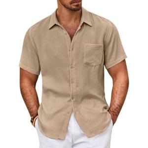 COOFANDY Men’s Knit Shirts Vintage Short Sleeve Button Down Shirt Casual Summer Beach Shirt(Khaki)