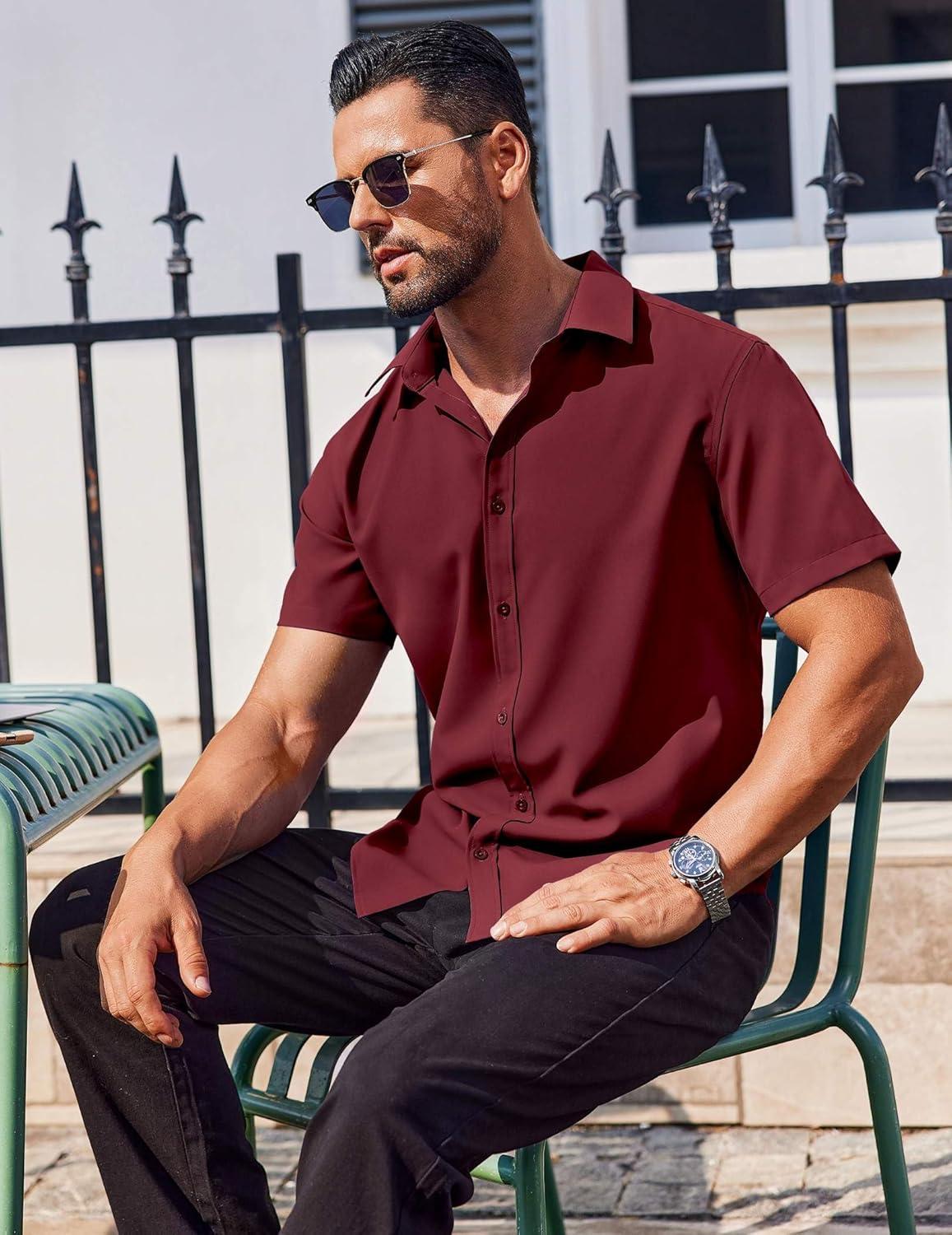 COOFANDY Men’s Casual Short Sleeve Button Down Shirts Untucked Dress Shirts Wrinkle Free Summer Wedding Shirts Solid(Red)