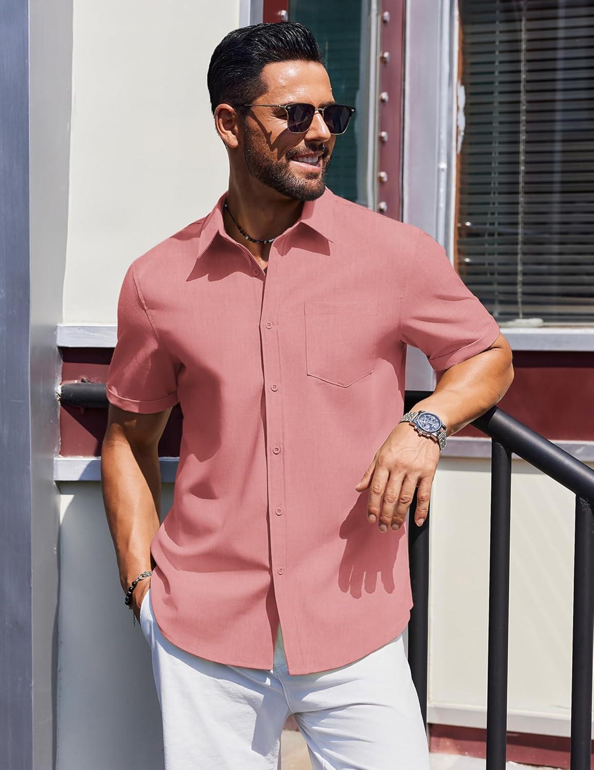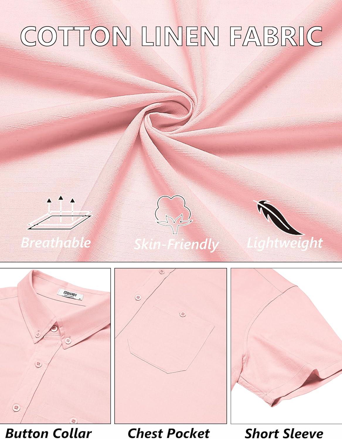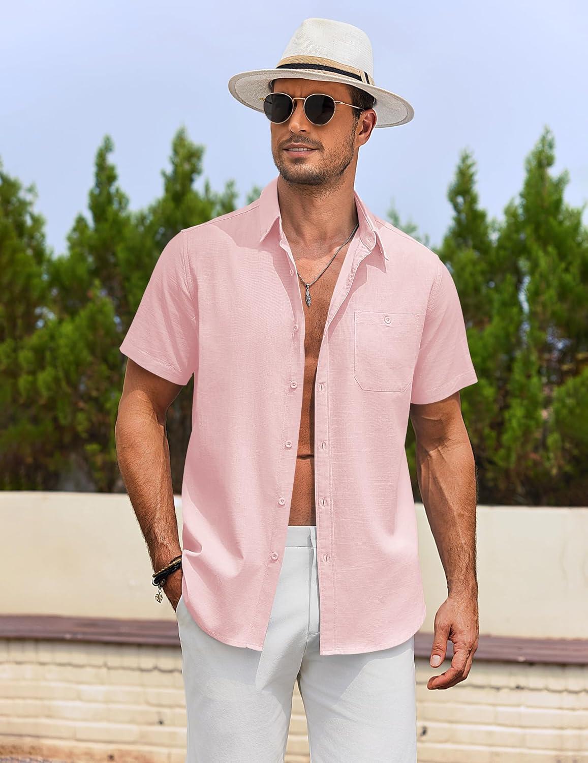 COOFANDY Men’s Cotton Linen Shirts Short Sleeve Casual Shirts Summer Button Down Shirt Linen Beach Vacation Shirt(Pink)