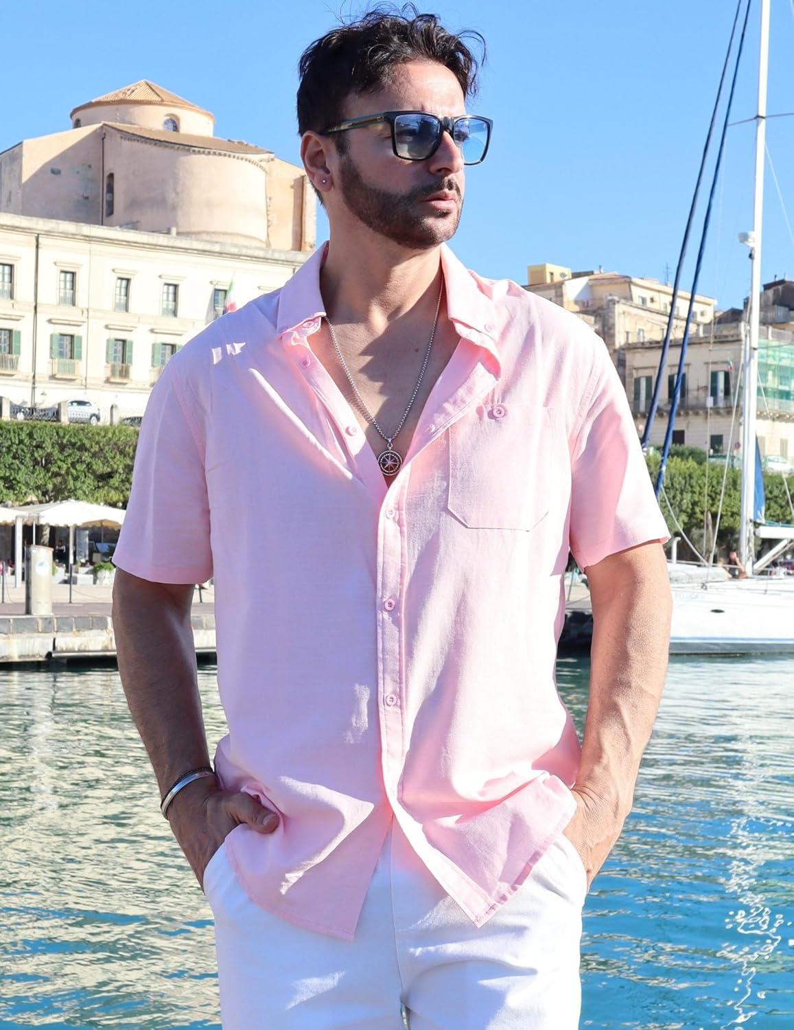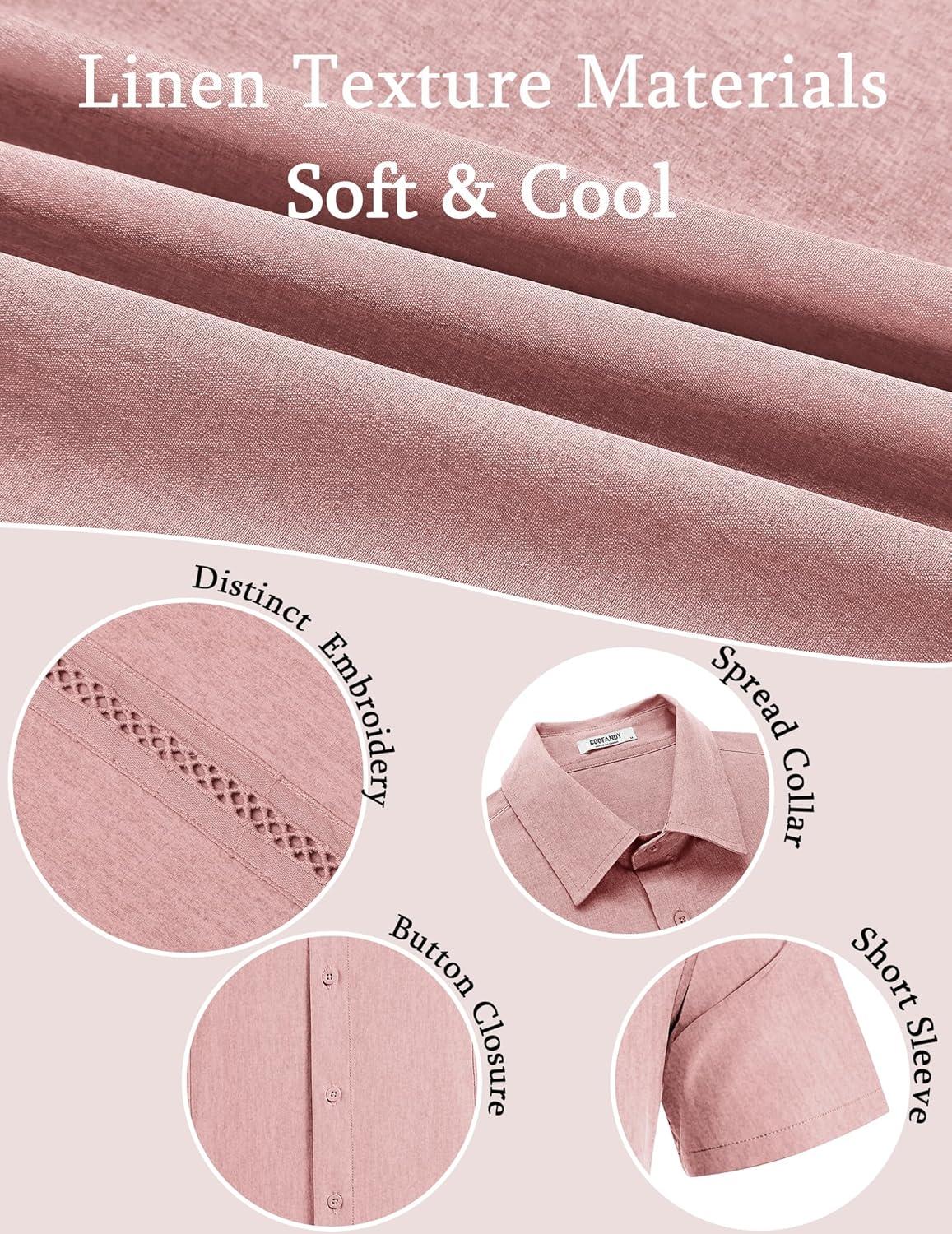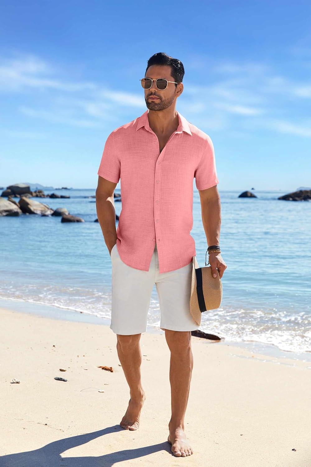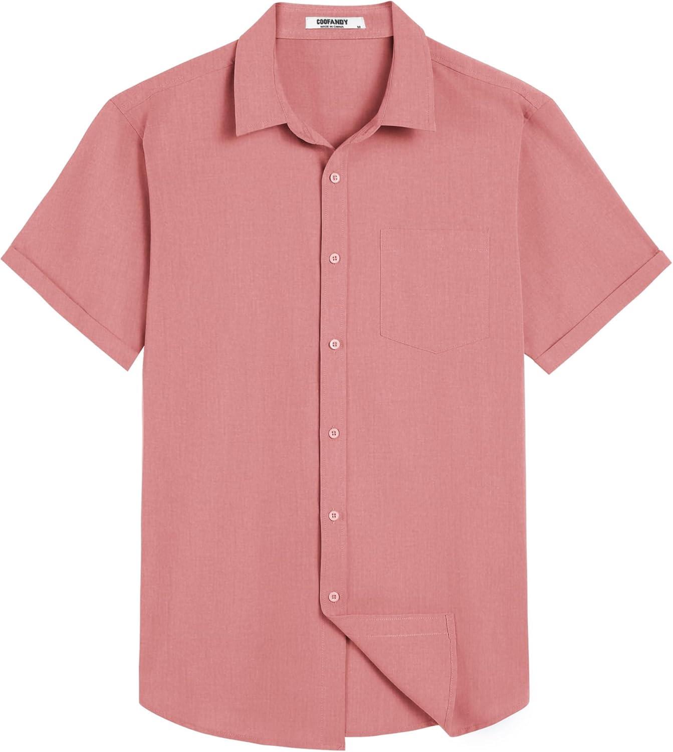 COOFANDY Men’s Cotton Linen Shirts Short Sleeve Casual Shirts Summer Button Down Shirt Linen Beach Vacation Shirt(Pink)