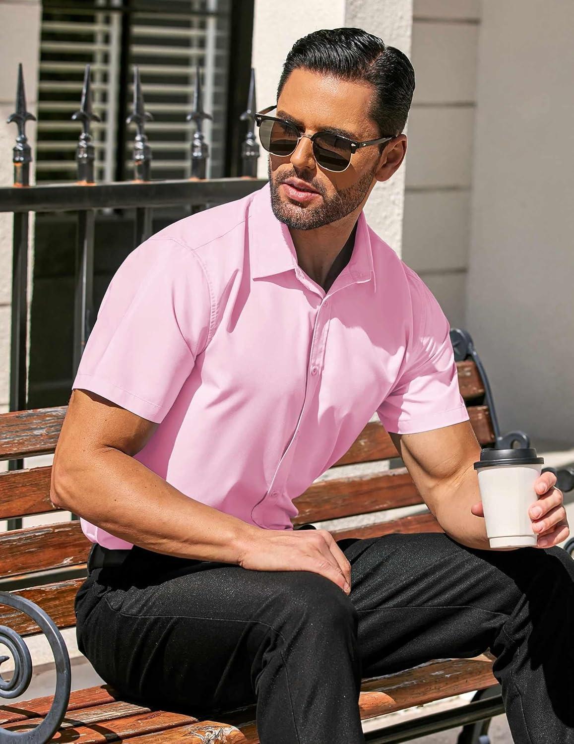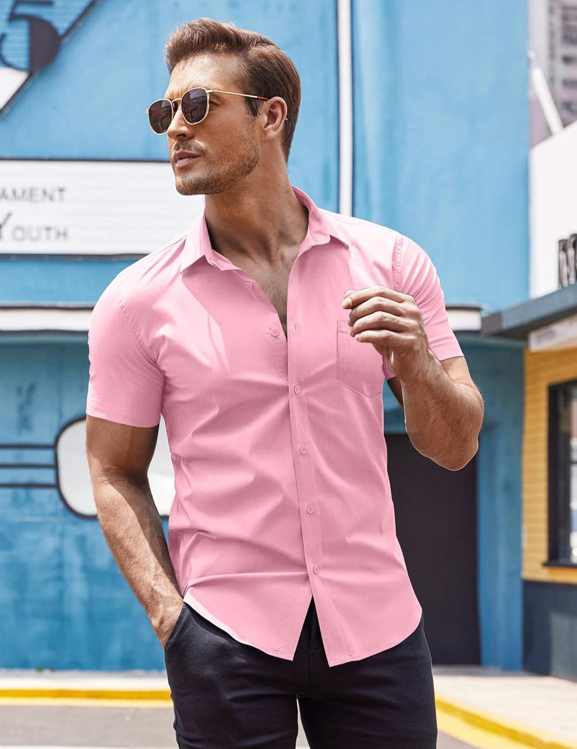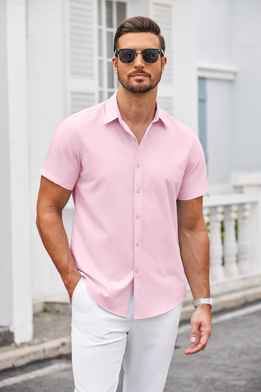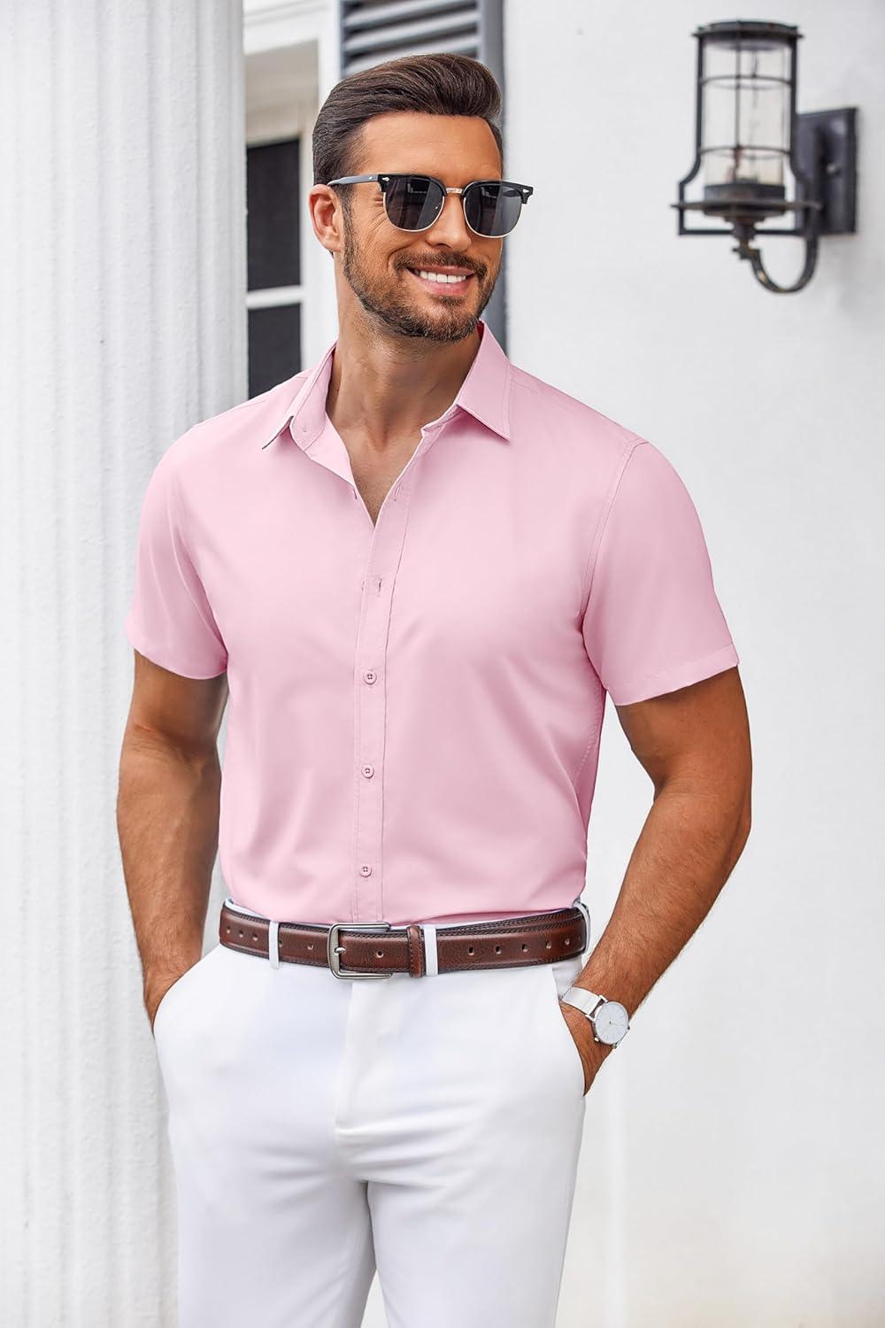 COOFANDY Men’s Dress Shirt Short Sleeve Button Down Shirts with Pocket(Pink)
