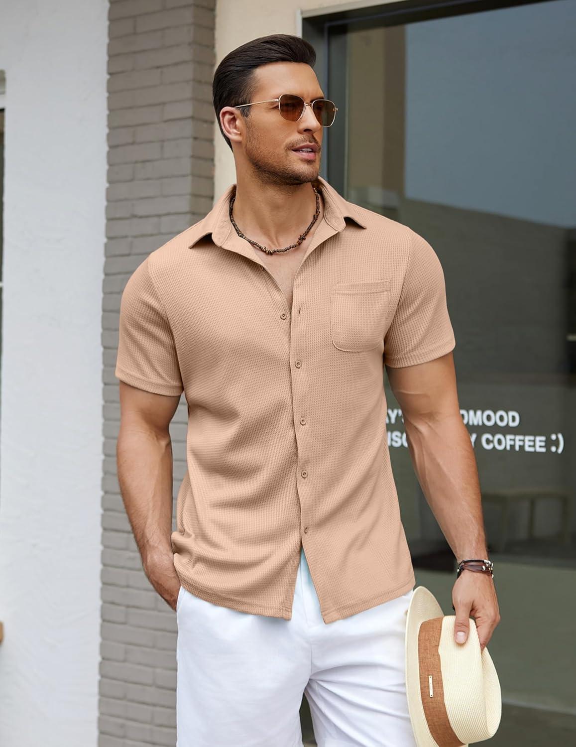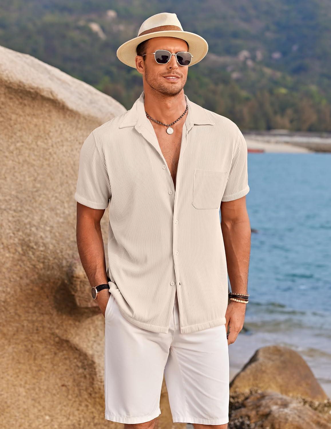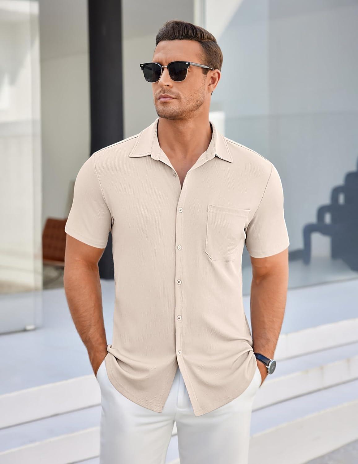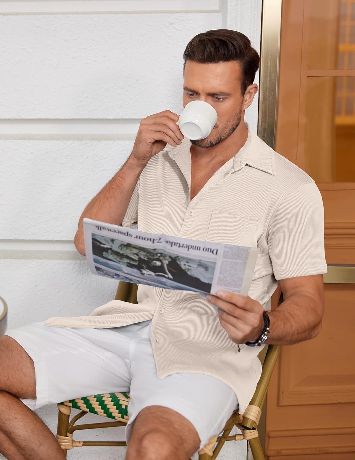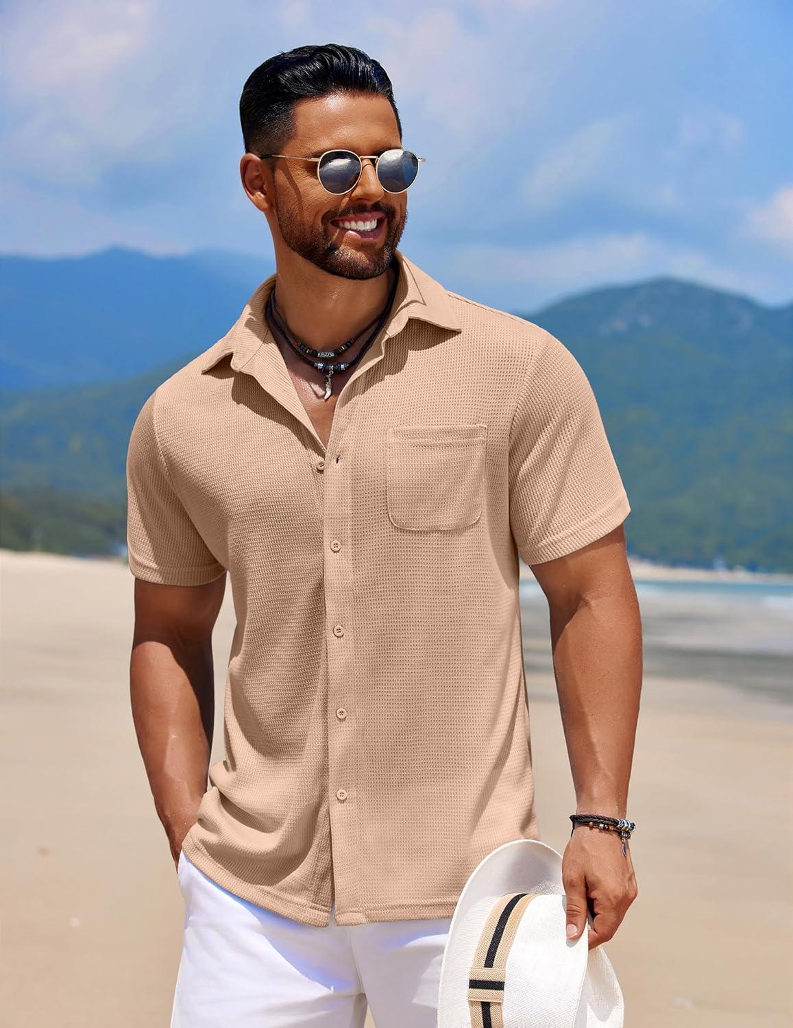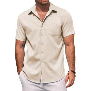 COOFANDY Mens 2025 Fashion Textured Shirts Short Sleeve Summer Beach Shirt Casual Button Down Shirts(Beige)