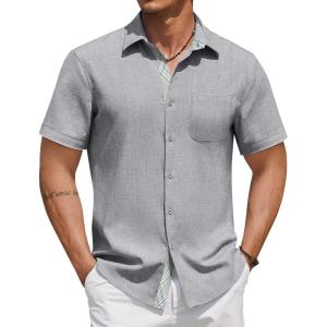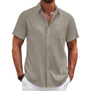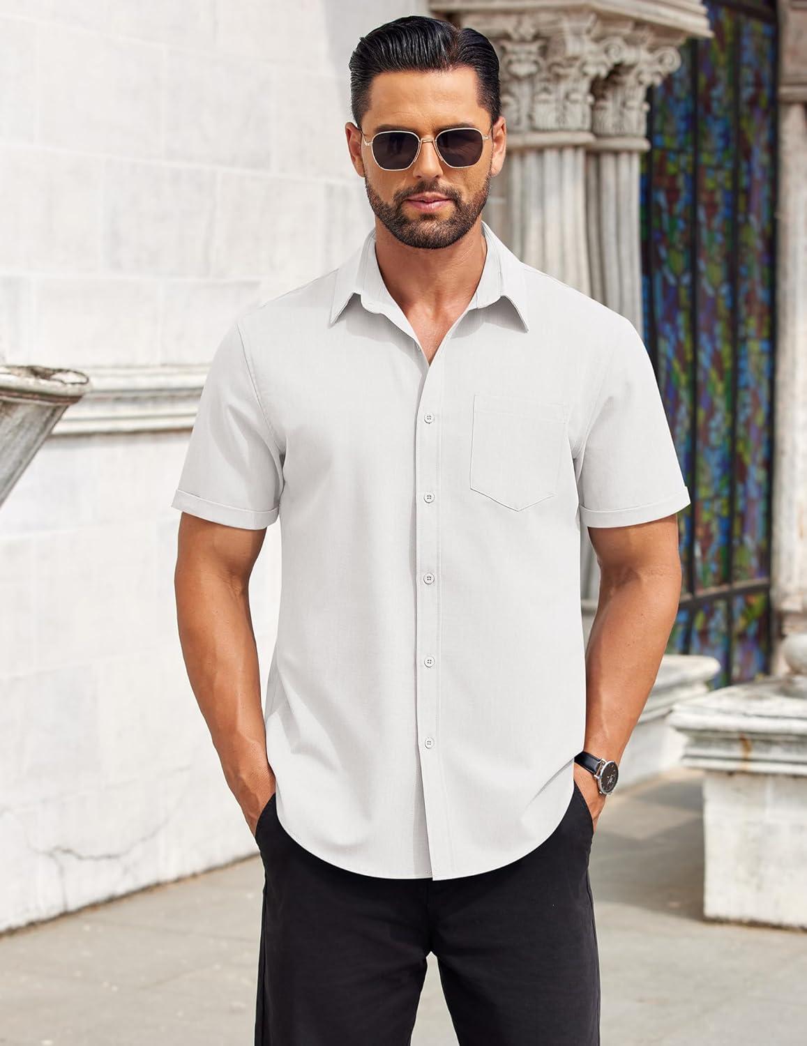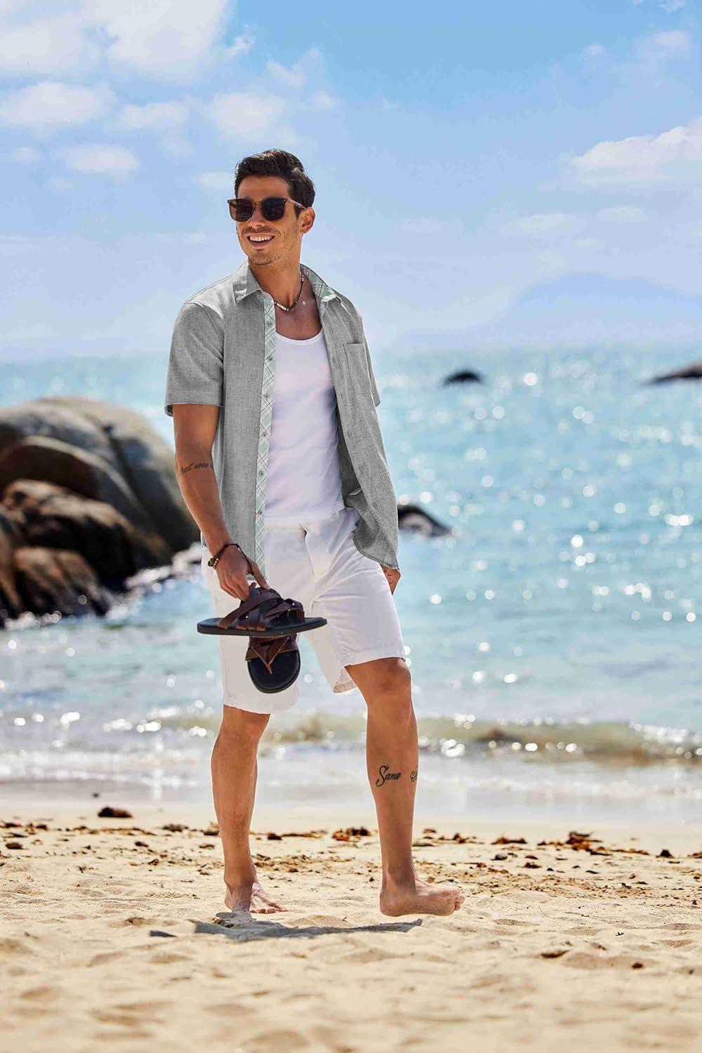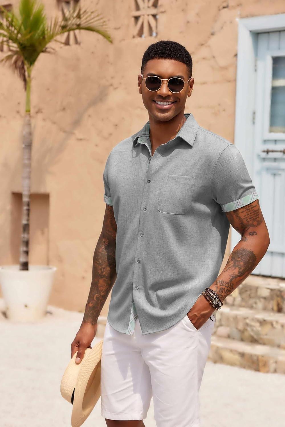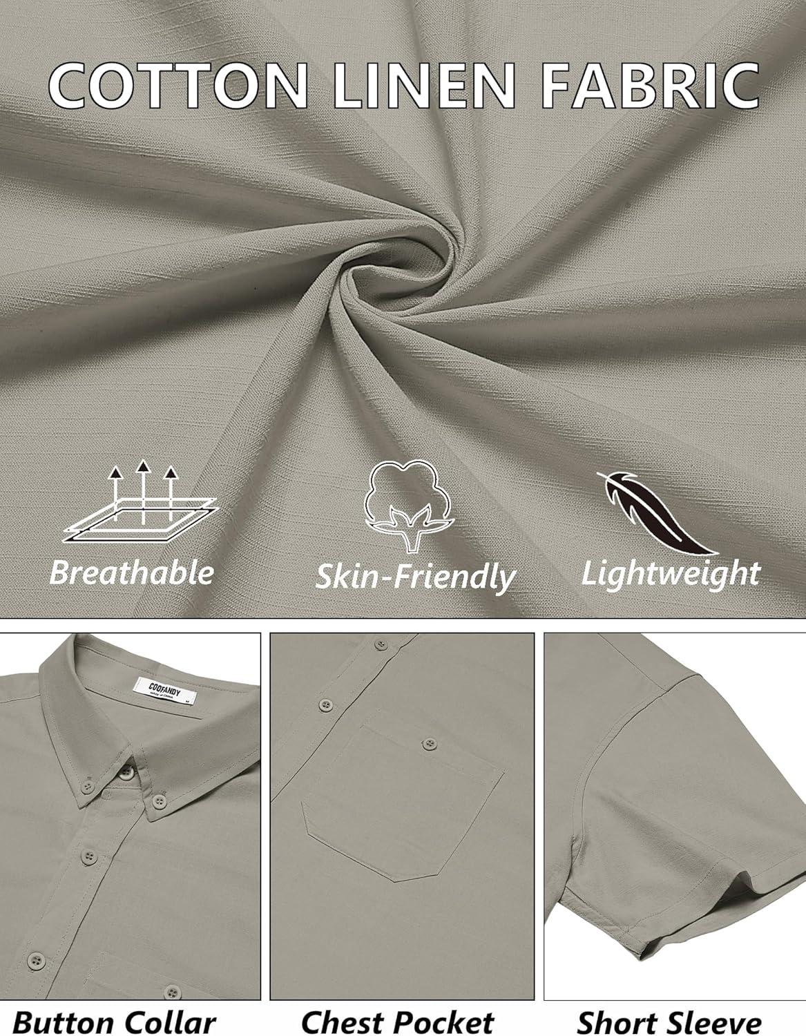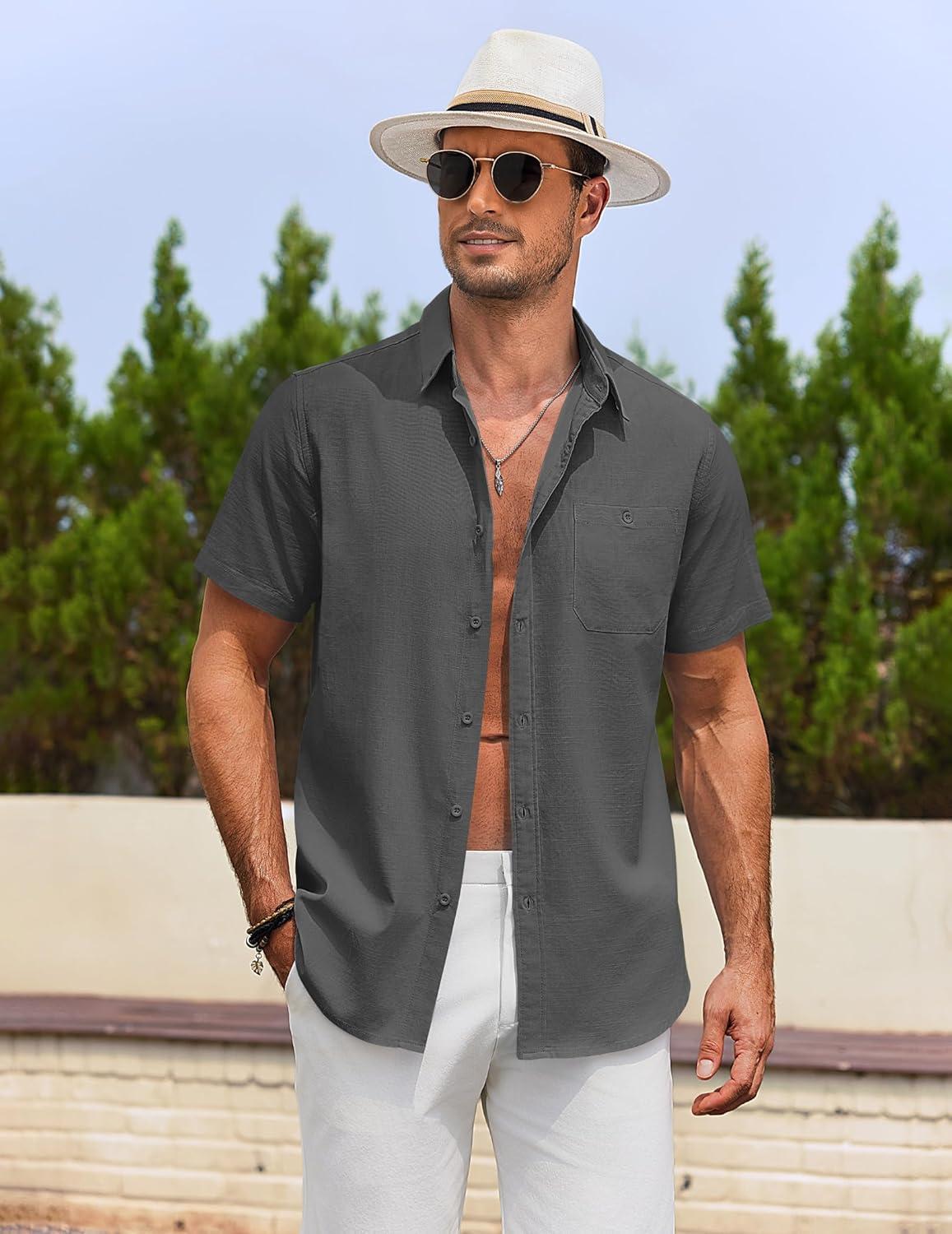 COOFANDY Men’s Cotton Linen Shirts Short Sleeve Casual Shirts Summer Button Down Shirt Linen Beach Vacation Shirt(Light Gray)