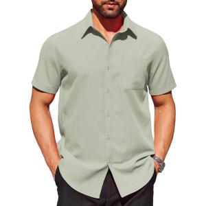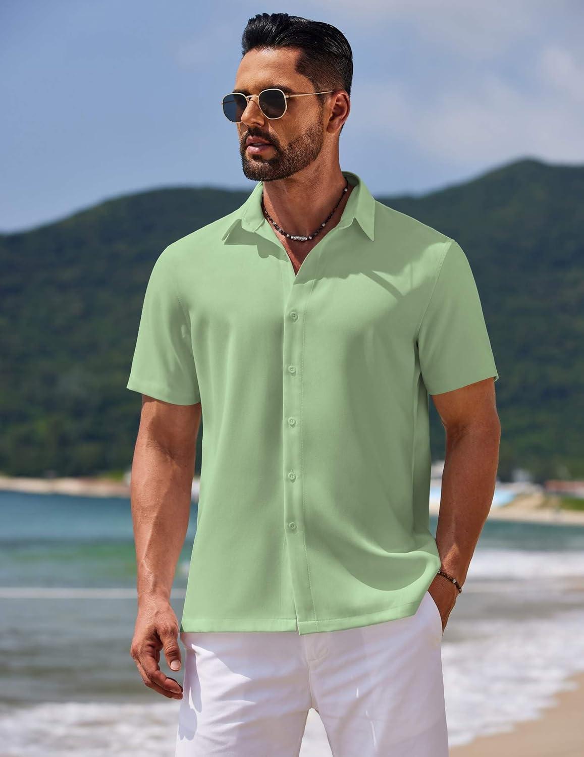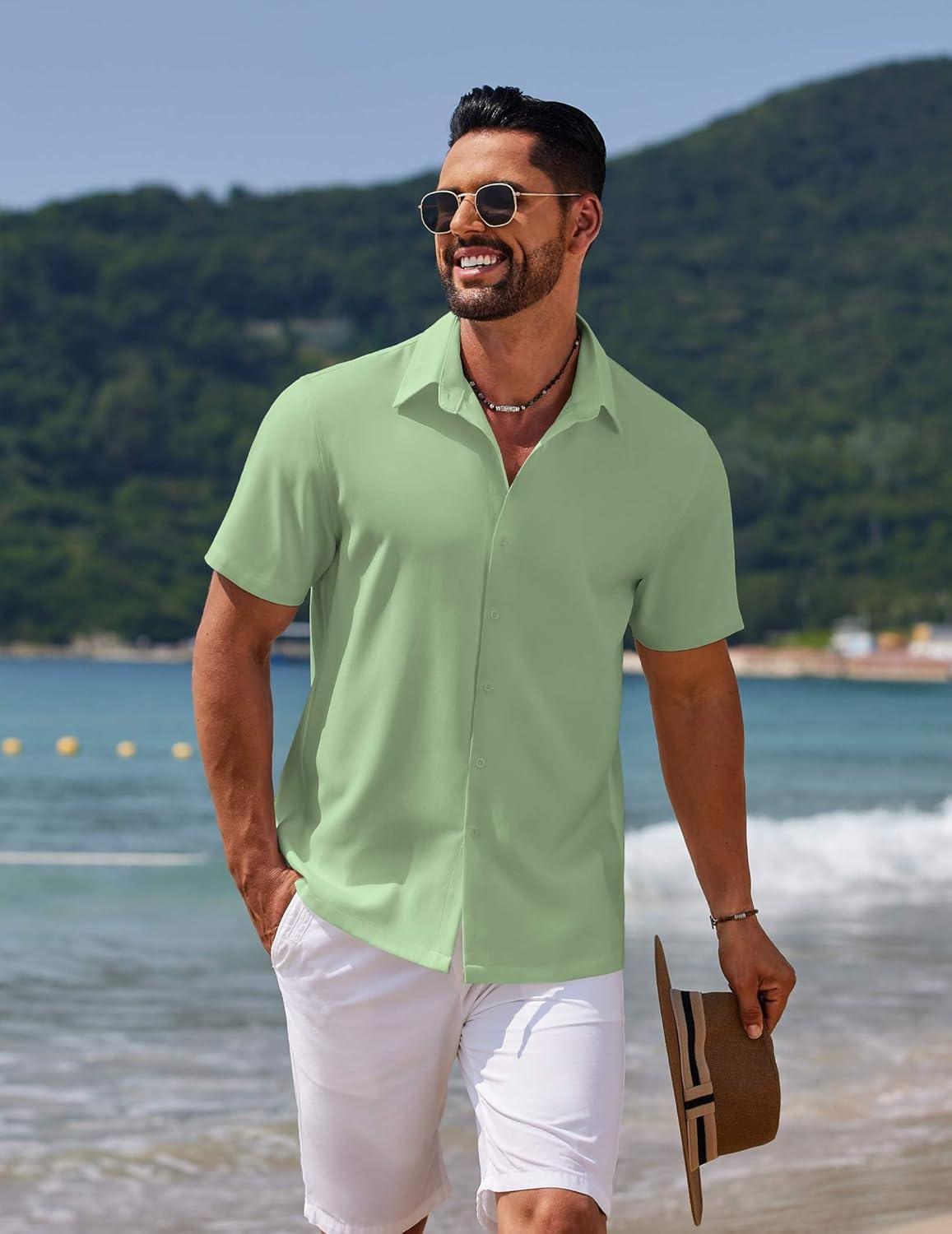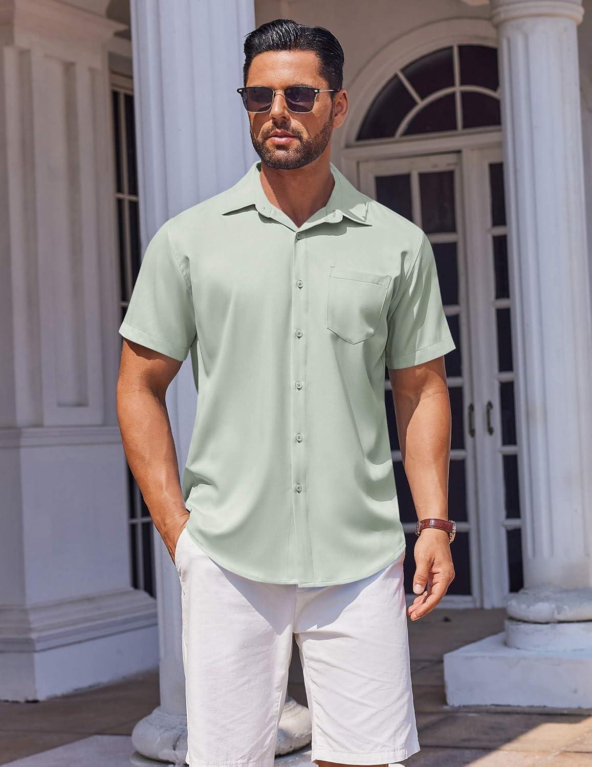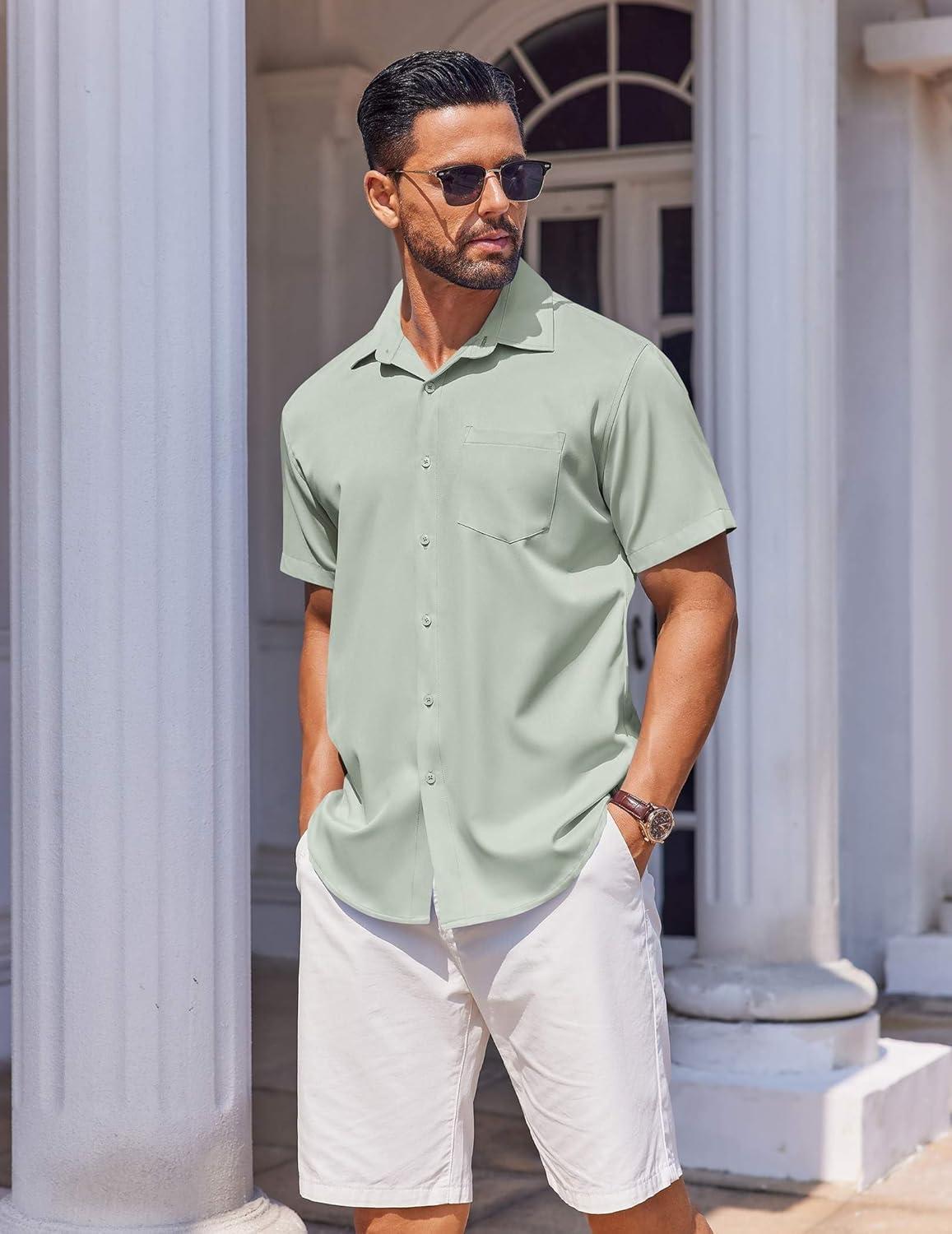 COOFANDY Mens Short Sleeve Button Down Shirts Casual Summer Beach Shirt Wedding Dress Shirts with Pocket(Light Green)